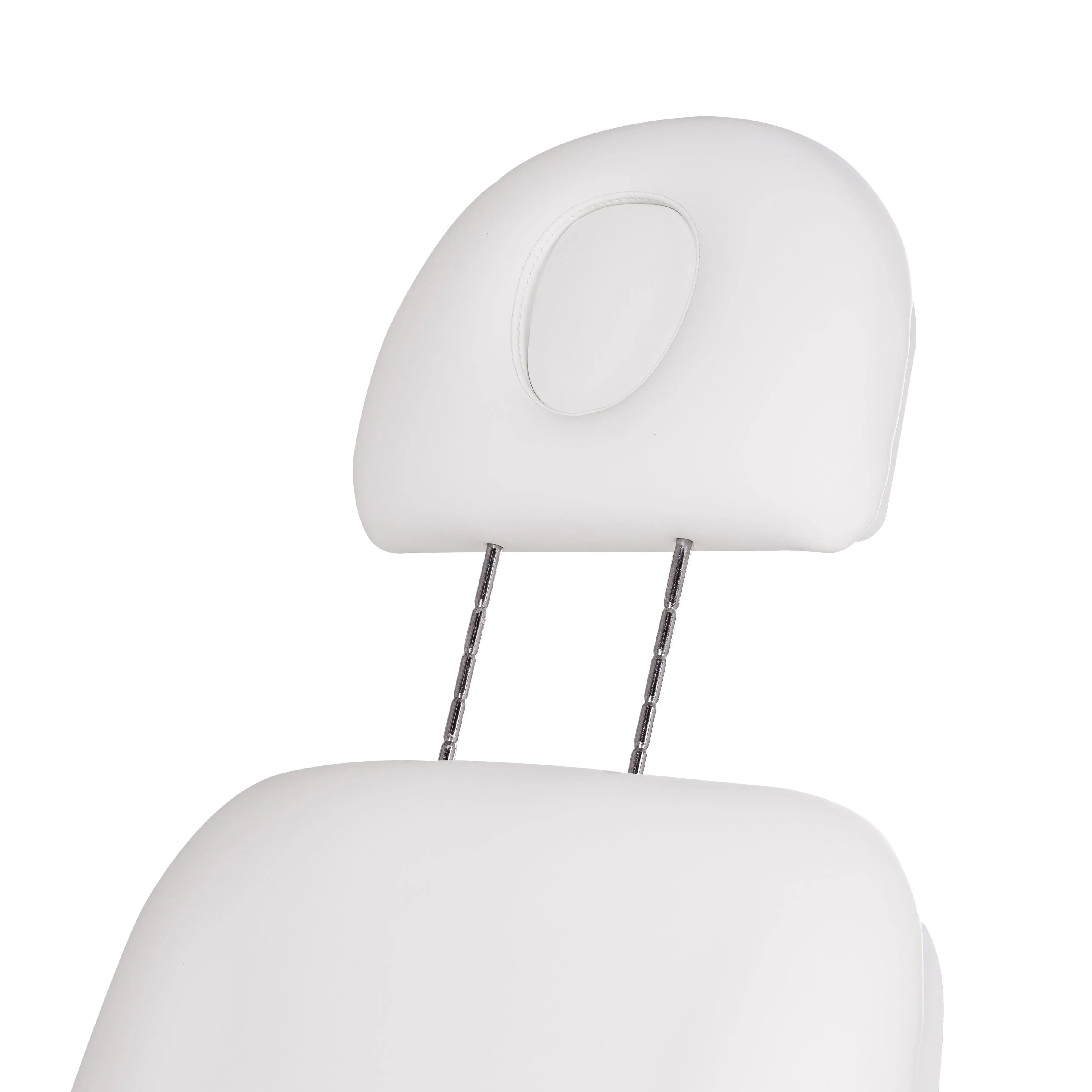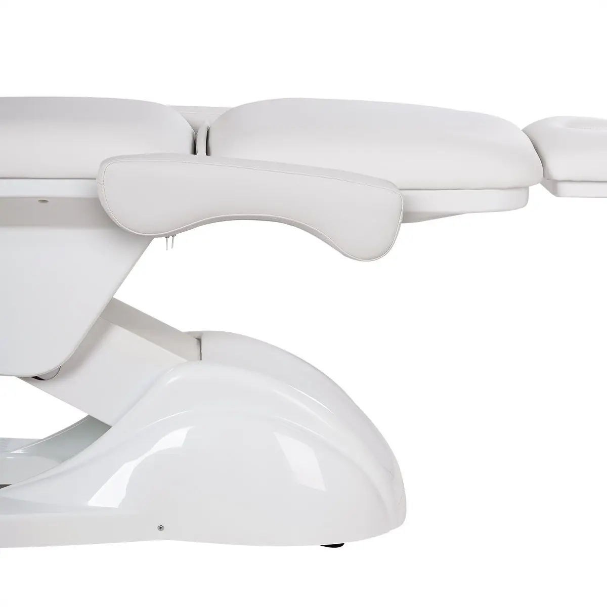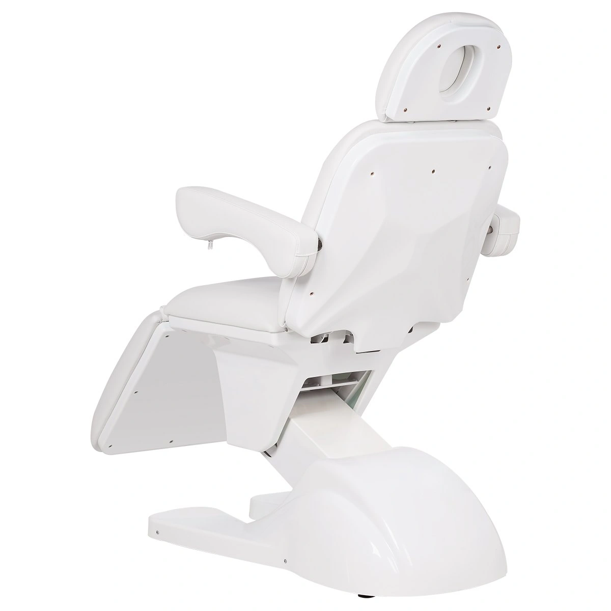У кресла усиленный каркас из прочного металла с широким устойчивым основанием на подпятниках, конструкция полностью раскладывается в горизонтальное положение, имеются подголовник с отверстием для лица и съёмные регулируемые подлокотники. Модель можно использовать для различных процедур: косметология, наращивание ресниц, педикюр, оформление бровей и т.д.