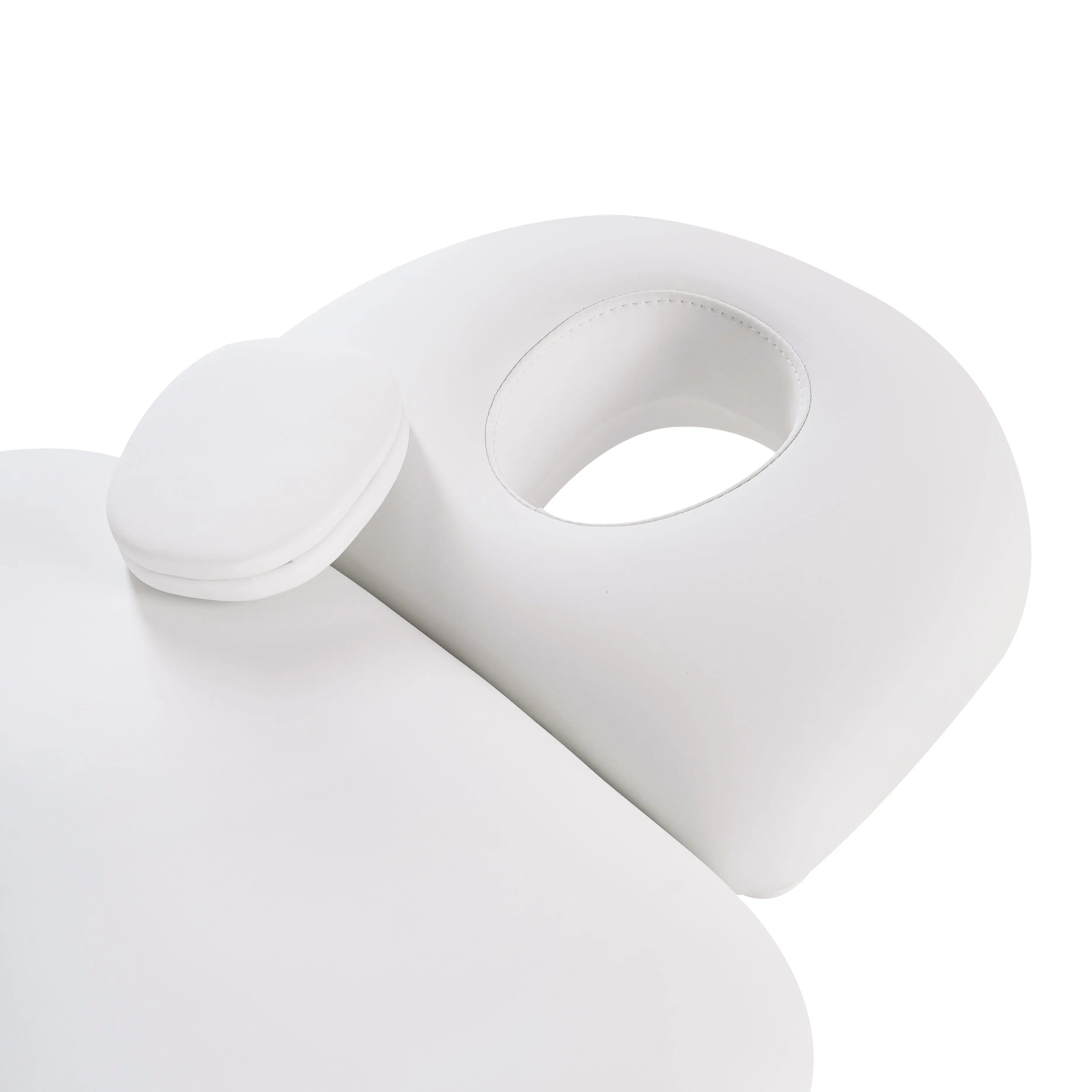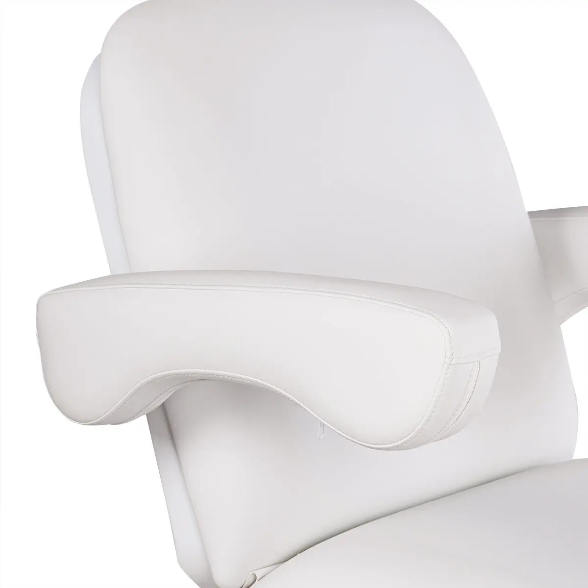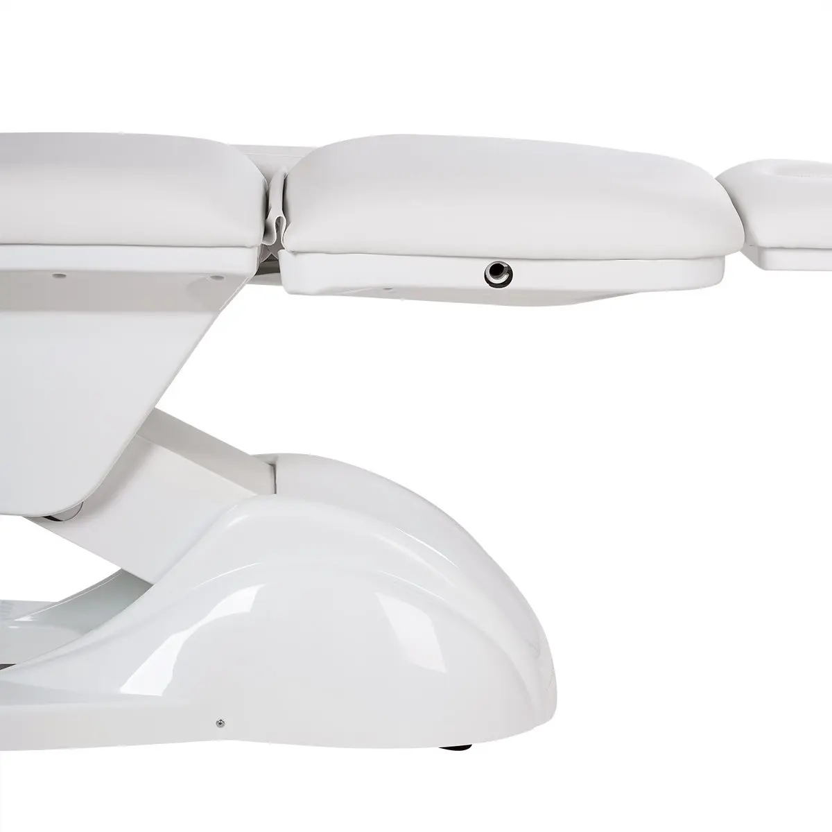 У кресла усиленный каркас из прочного металла с широким устойчивым основанием на подпятниках, конструкция полностью раскладывается в горизонтальное положение, имеются подголовник с отверстием для лица и съёмные регулируемые подлокотники. Модель можно использовать для различных процедур: косметология, наращивание ресниц, педикюр, оформление бровей и т.д.
