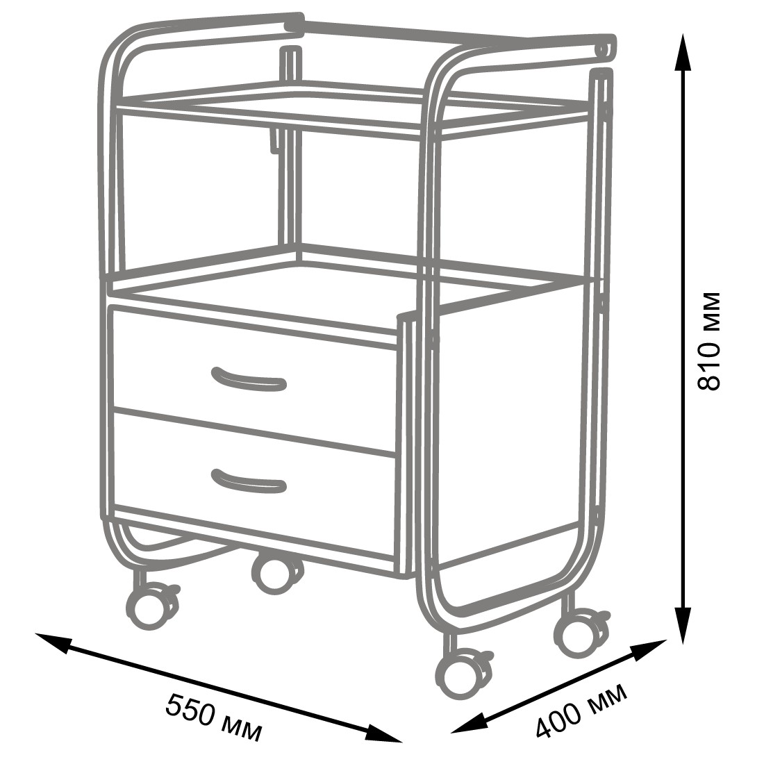 Комплектация: металлическая основа, тумба с двумя выдвижными ящиками, верхняя полочка, 4 вращающихся колеса.