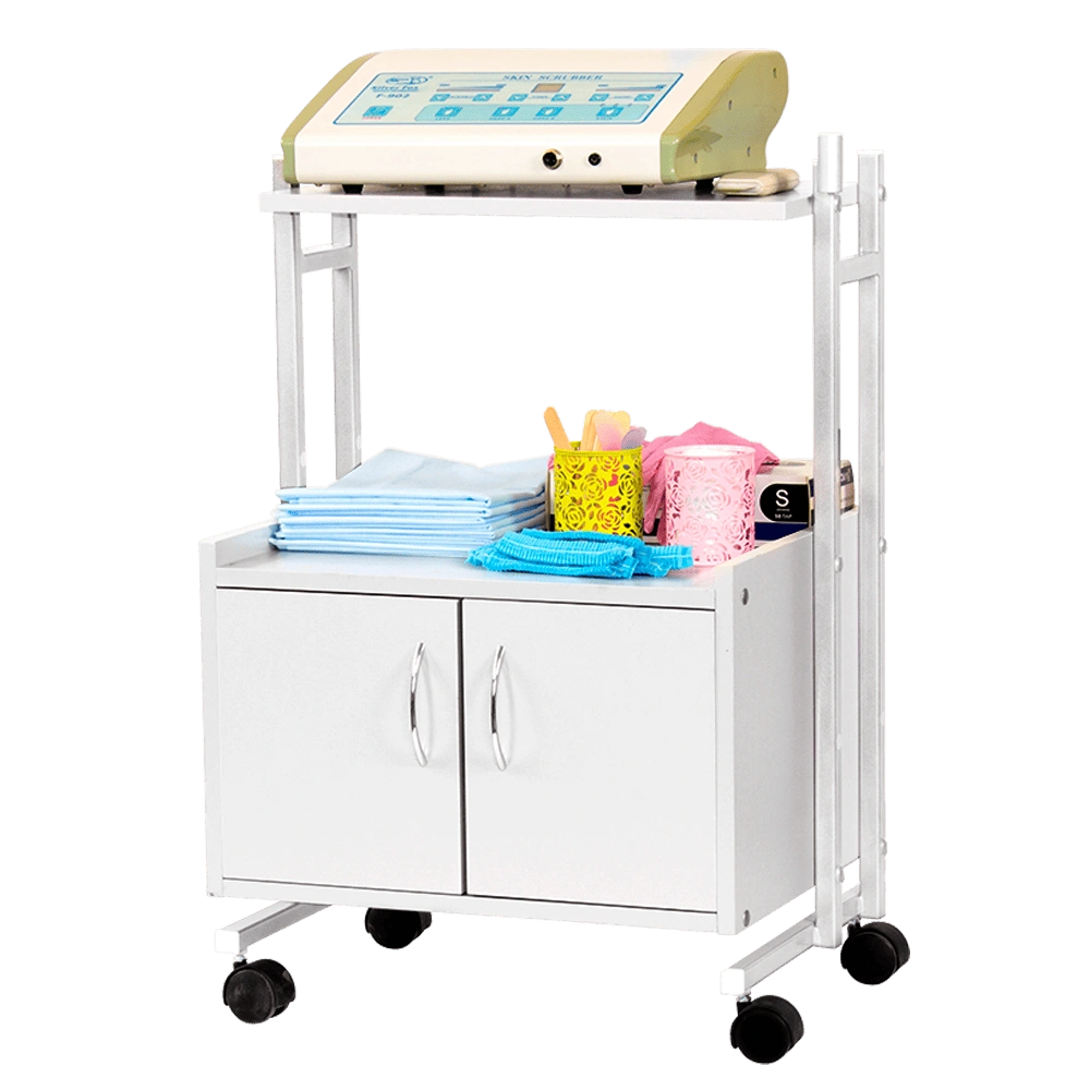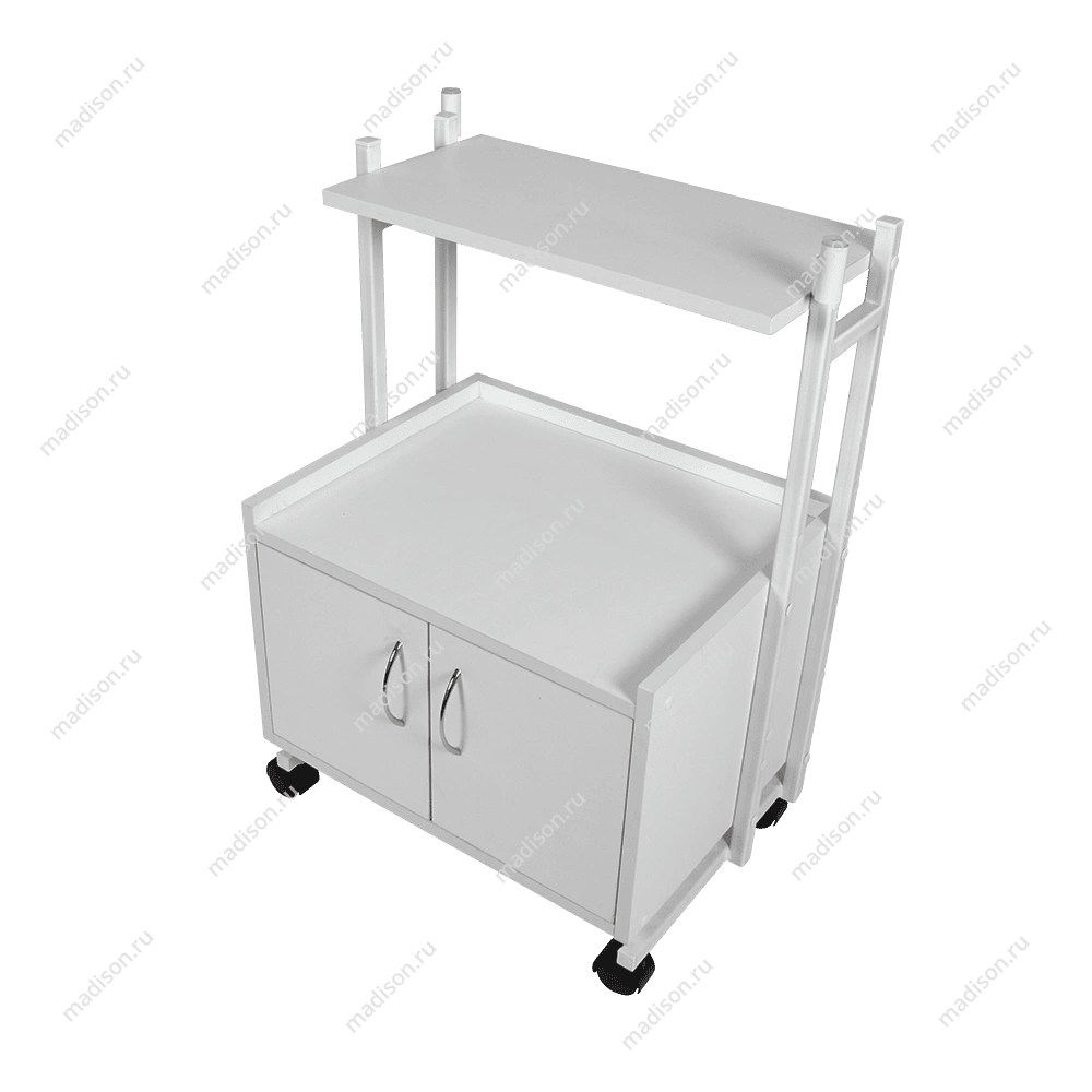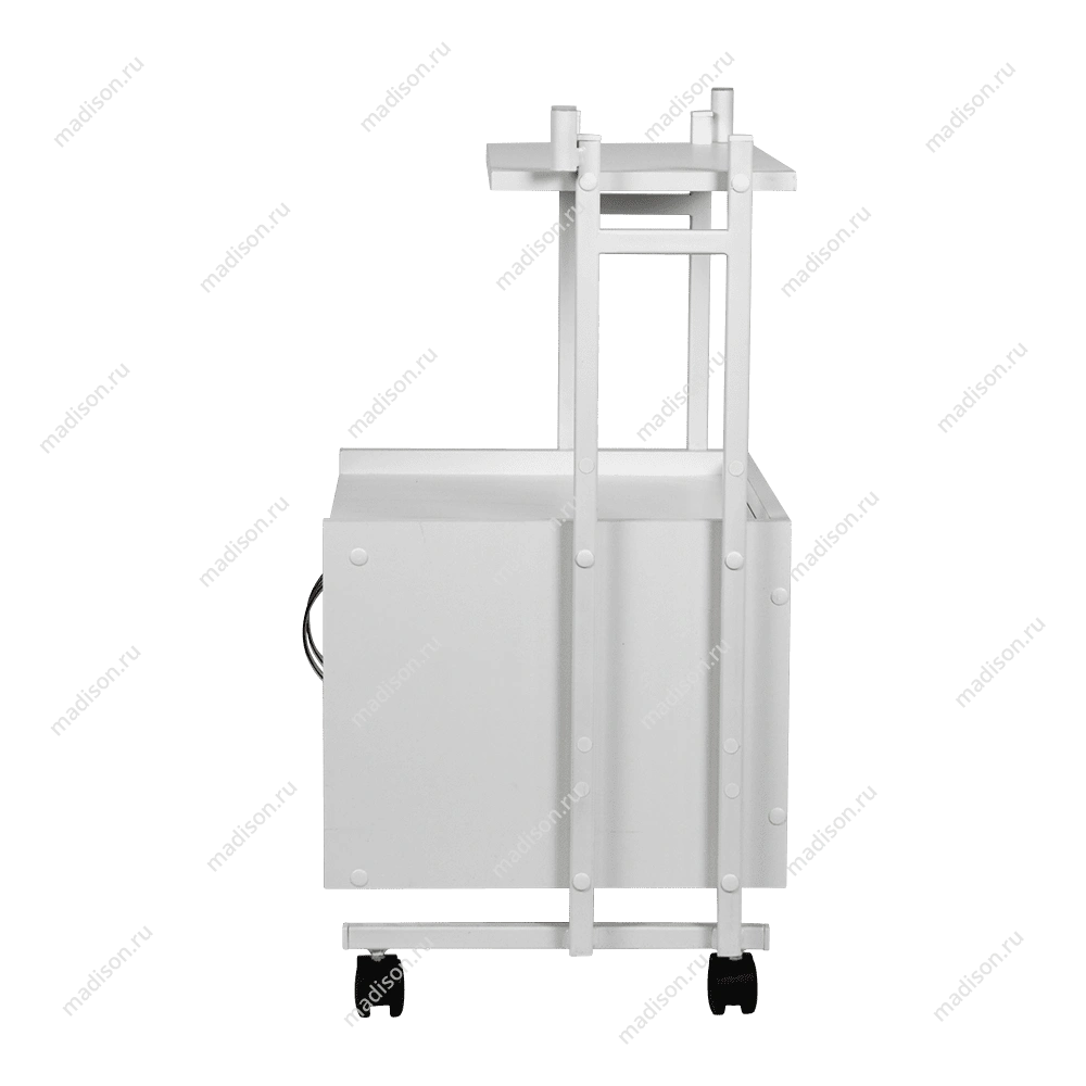 Каркас тележки – прочная сталь, покрытая белой порошковой краской с антикоррозийными свойствами. Основа установлена на вращающиеся колеса, благодаря которым тележку легко перемещать по рабочей площади. На верхней полке косметологического оборудования мастер может разложить инструменты и материалы, использующиеся во время процедур. Полочка и шкафчик изготовлены из ламинированной ДСП.