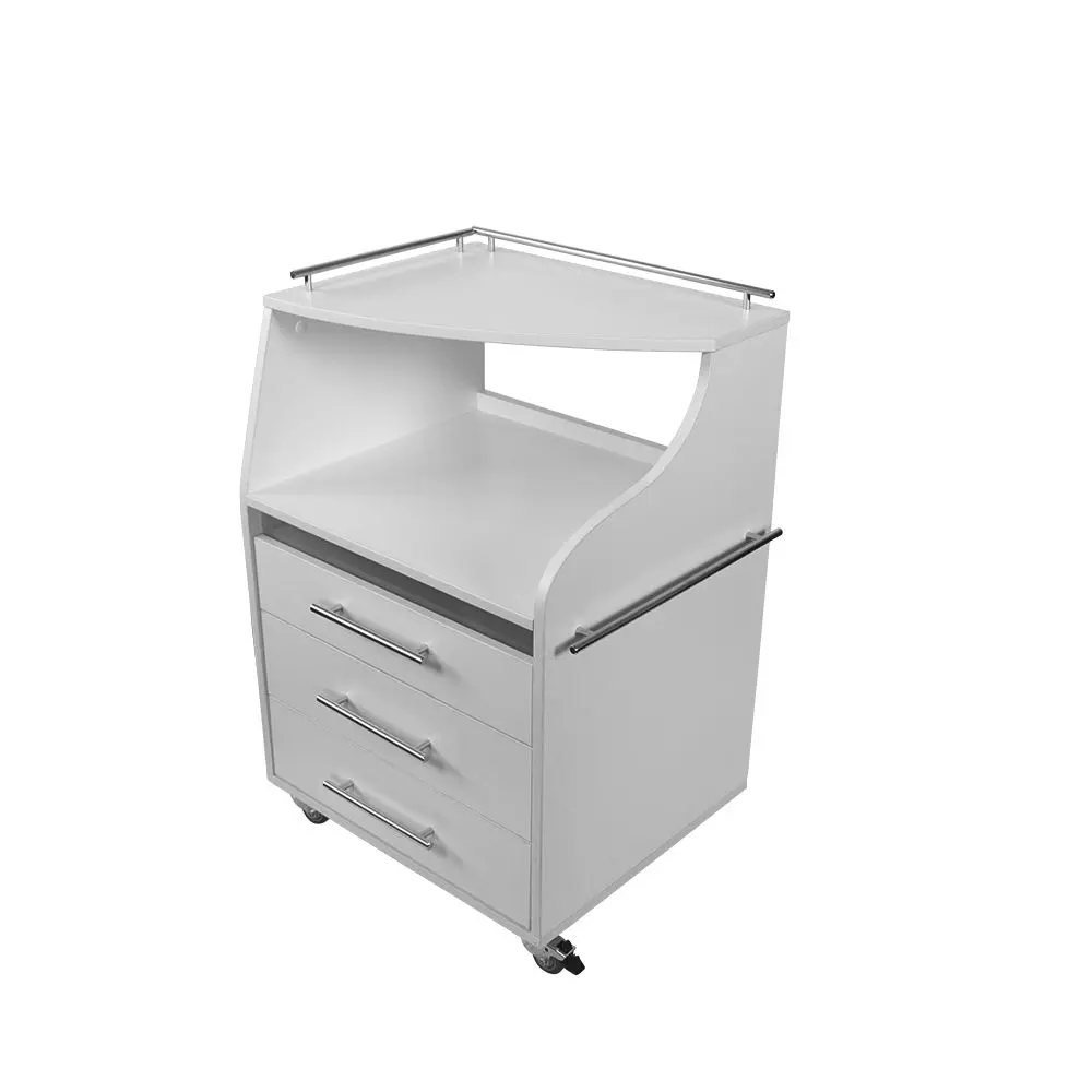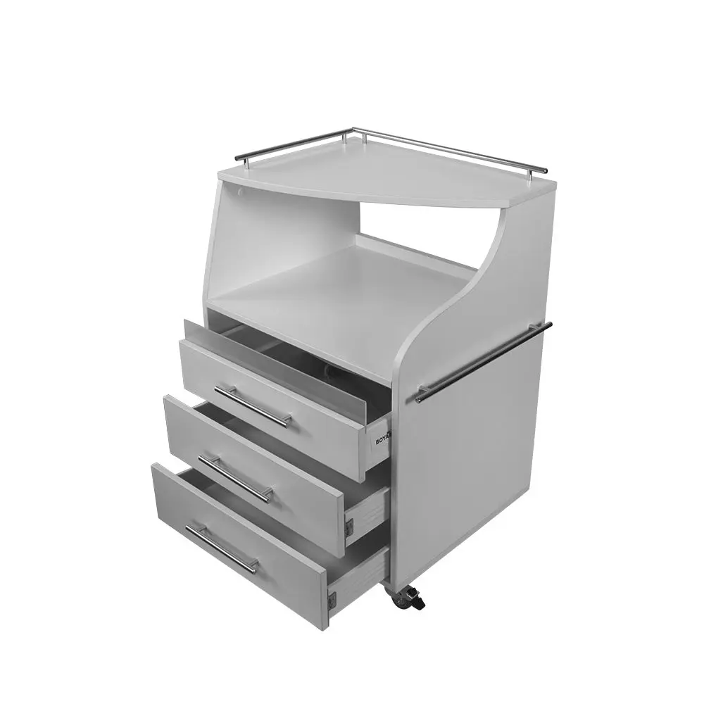 Тумба изготовлена из ЛДСП с водостойкими свойствами. Материал устойчив к обработке моющими и дезинфицирующими средствами. Все детали тумбы оклеены кромкой для защиты от намокания. Ящики в тумбе открываются и закрываются бесшумно за счет автоматического доводчика. Хромированные ручки придают оборудованию эстетически привлекательный внешний вид. Колеса из резины не повредят напольное покрытие.