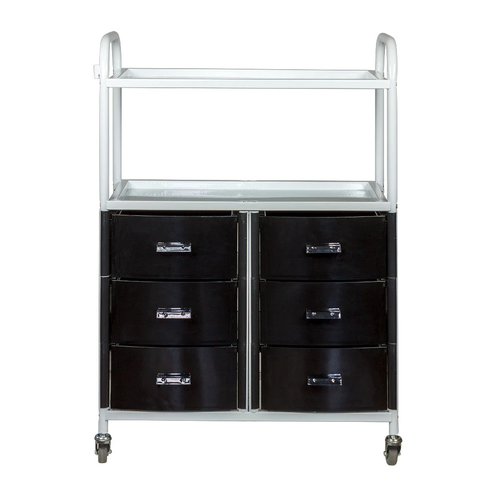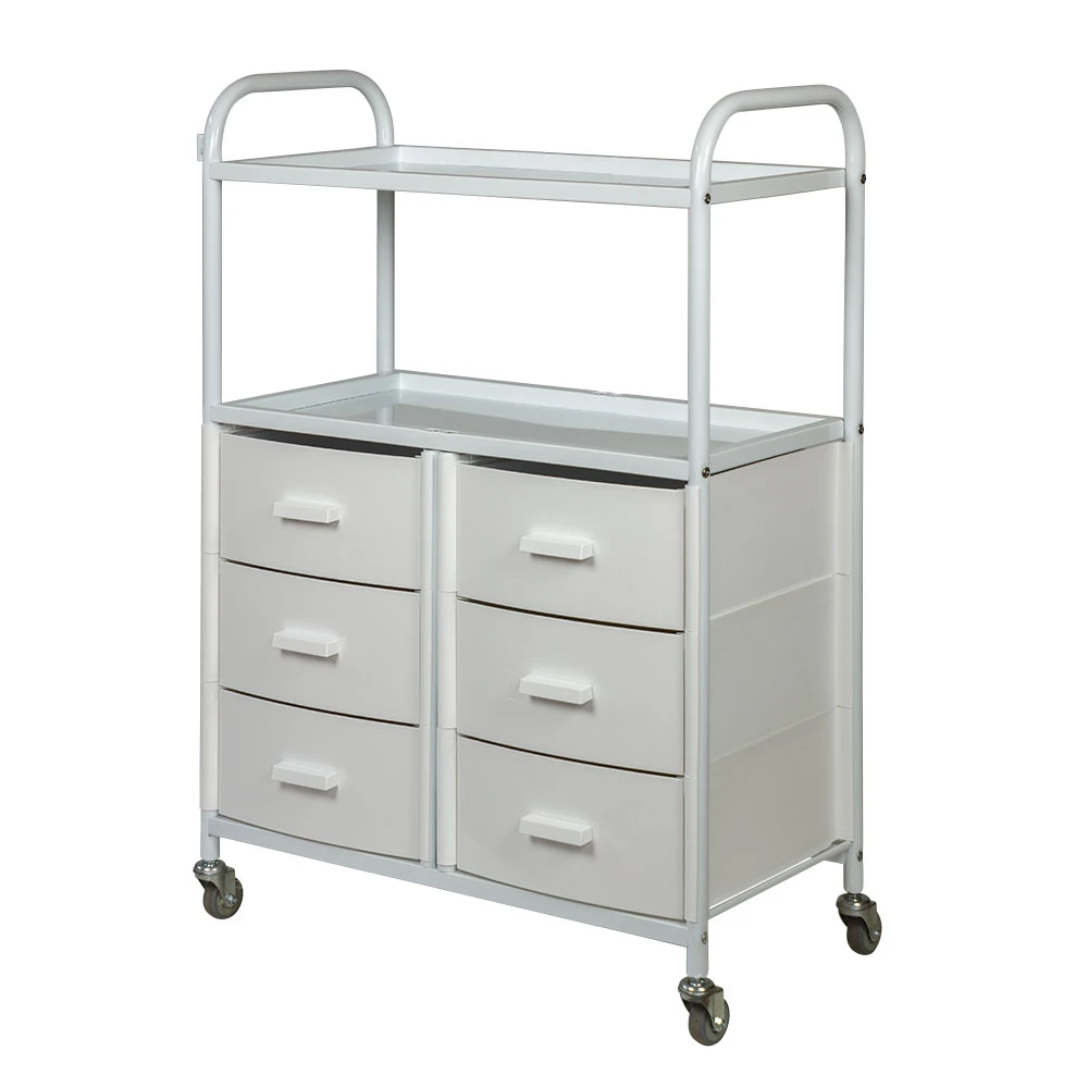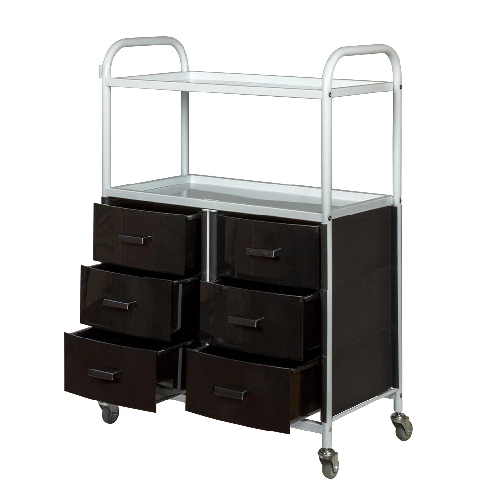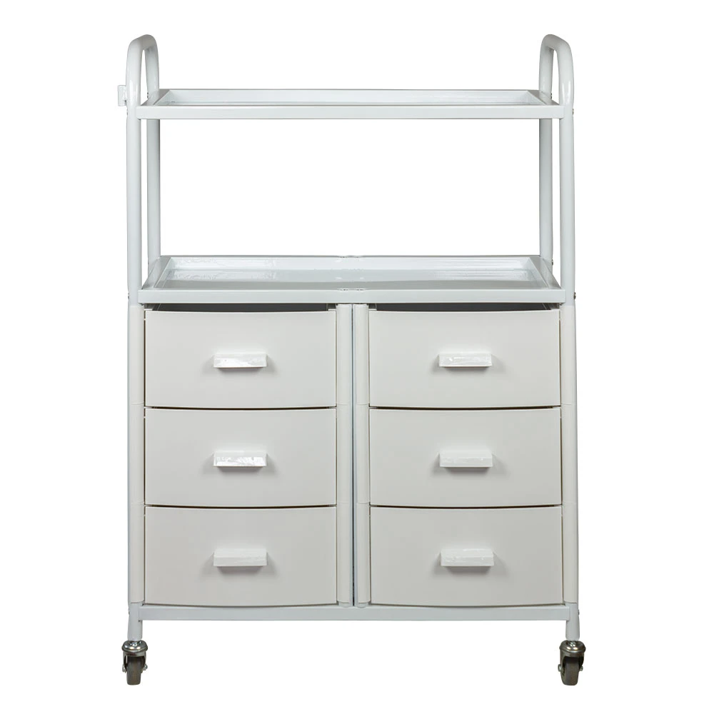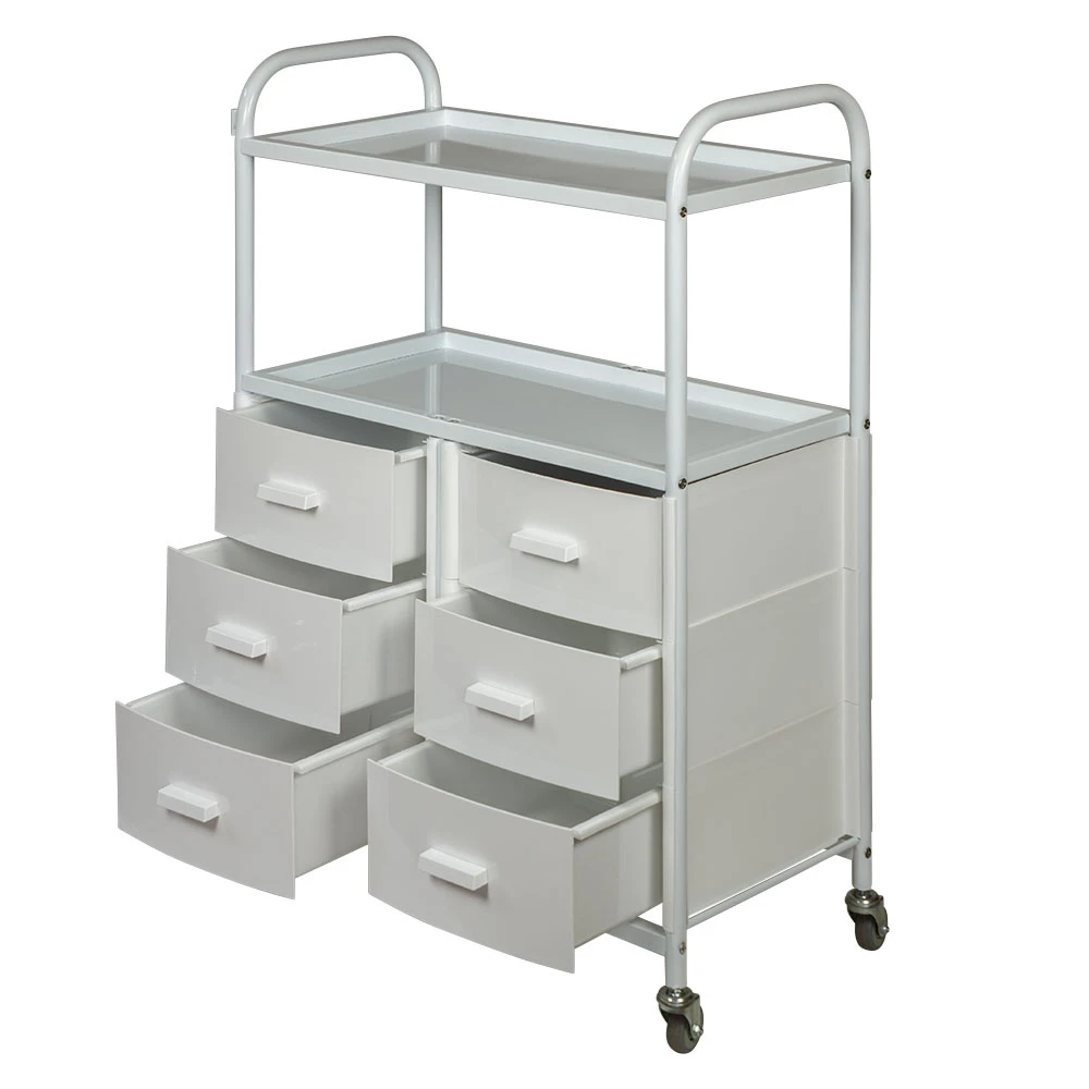 Для инструментов, аксессуаров и расходных материалов достаточно места в шести выдвижных ящиках. Полки можно использовать как для необходимых приспособлений, так и для установки небольших аппаратов. Несомненным плюсом косметологического оборудования являются встроенные маневренные колесики. Мастер без особых усилий может перемещать косметологическую тележку по рабочей зоне.