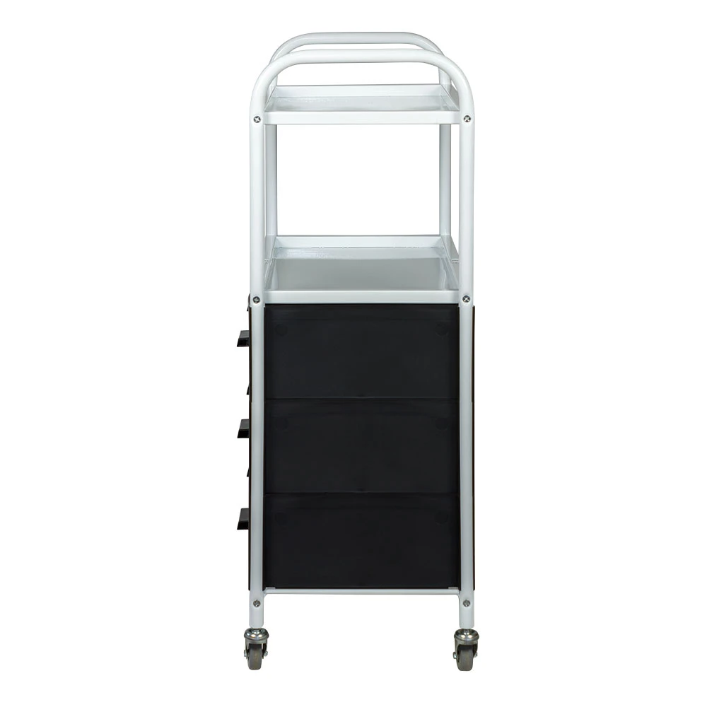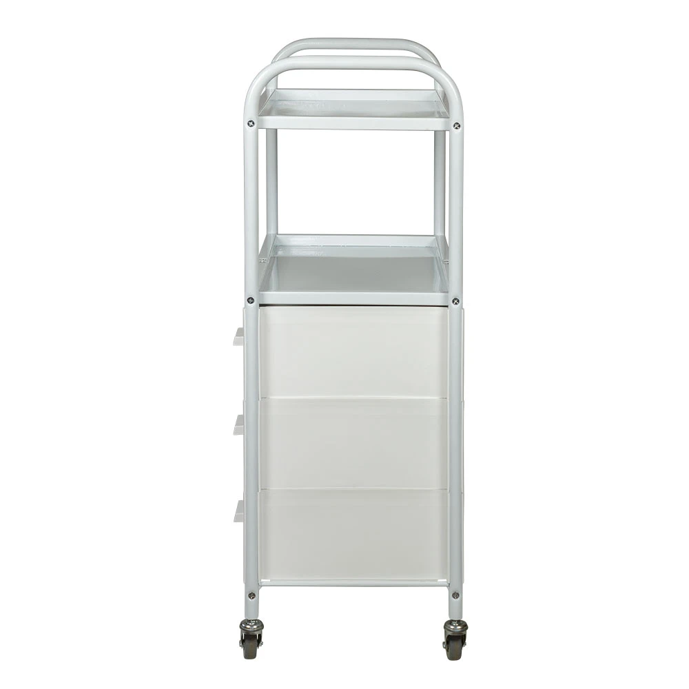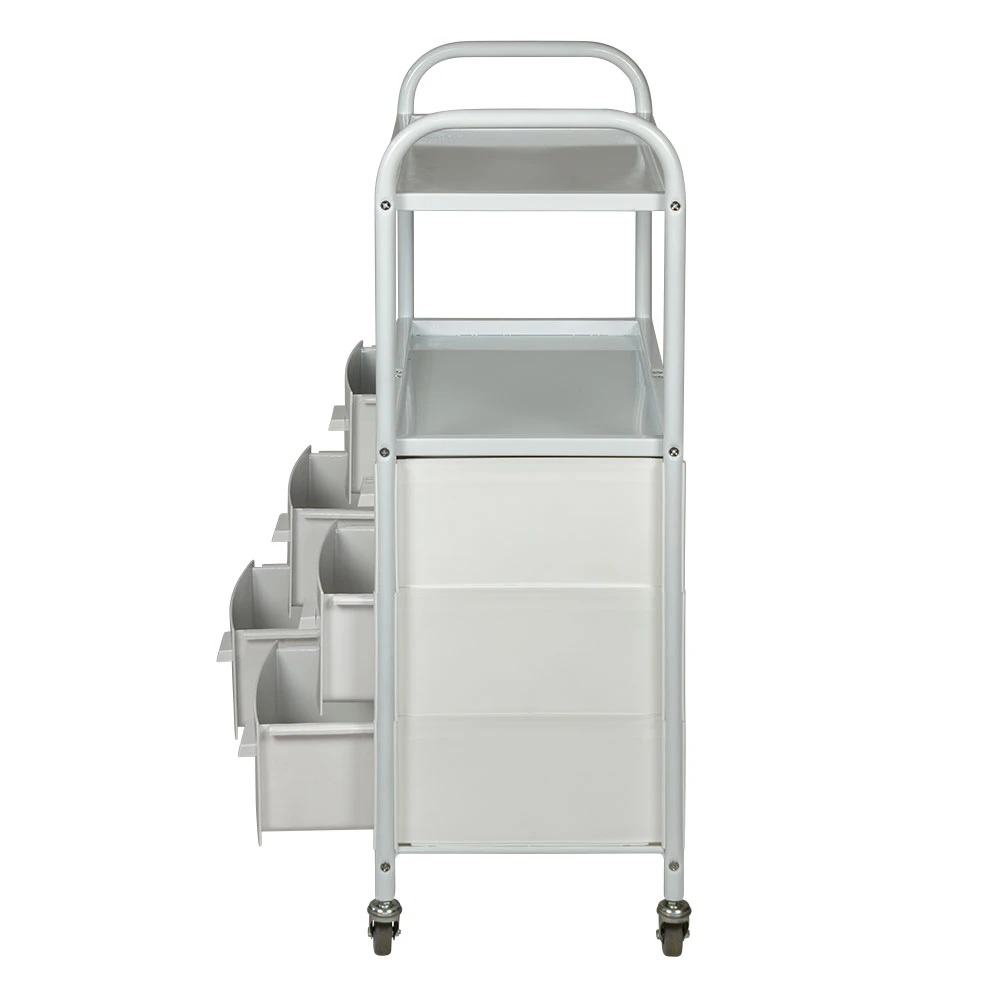 Каркас выполнен из прочного металла, поэтому косметологическая тележка выдержит на себе огромную загруженность инструментами и разными приспособлениями. Боковые панели и ящики изготовлены из ударопрочного пластика. Для полок использованы цельные металлические листы. Для защиты от коррозии и влаги поверхности металла защищены специальной краской. Материал прекрасно переносит чистку моющими и дезинфицирующими средствами.