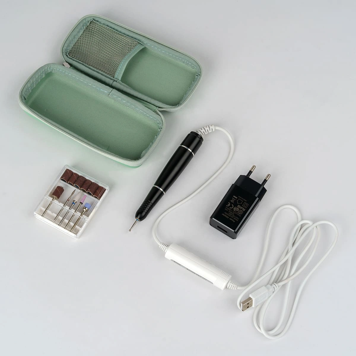 Комплектация: чехол, ручка с микромотором, фрезы.