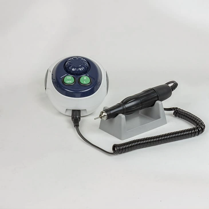 Устройство состоит из блока из питания, ручки с микромотором и подставки. На блоке питания расположены ячейки для фрез, что поможет поддерживать порядок на рабочем месте и иметь необходимые инструменты всегда под рукой. Для ручки предусмотрена отдельная подставка. Кнопкой реверса удобно менять направление вращения. Компактное оборудование можно сложить в стильную сумочку и взять с собой для выездной работы.