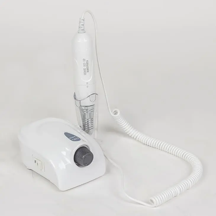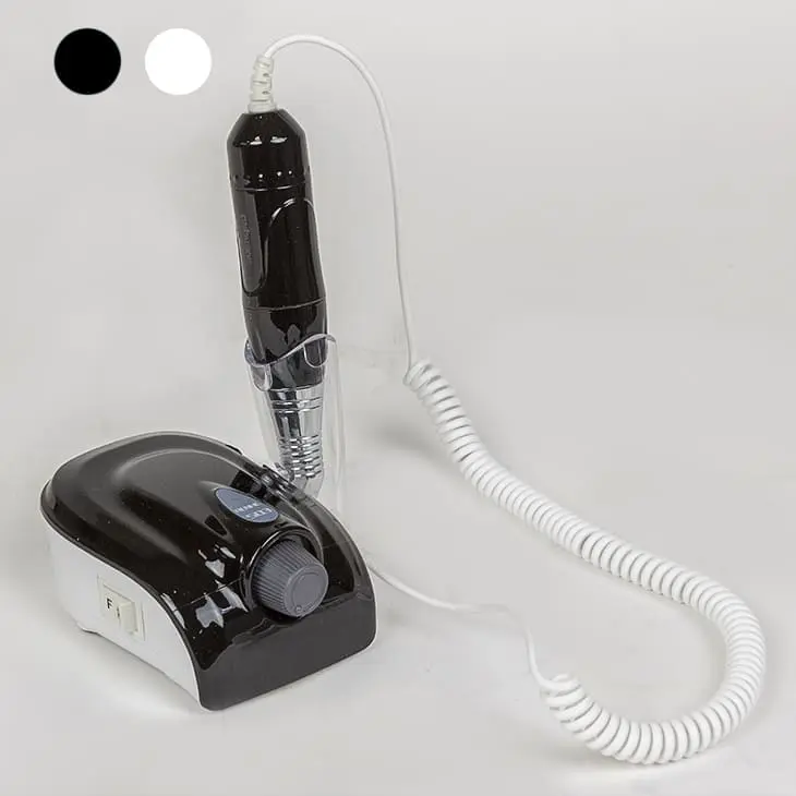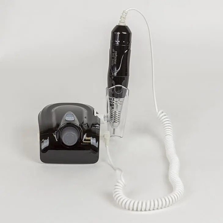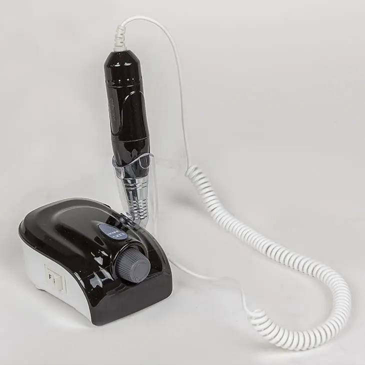 Аппарат для маникюра – небольшое устройство, которое состоит из блока питания и ручки с микродвигателем. На ручке есть цанговый зажим, в котором фиксируется фреза. Кнопки смены скорости и реверса находятся на корпусе блока питания. С боковой стороны блока предусмотрен держатель для ручки.