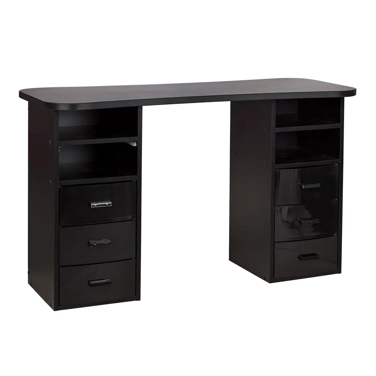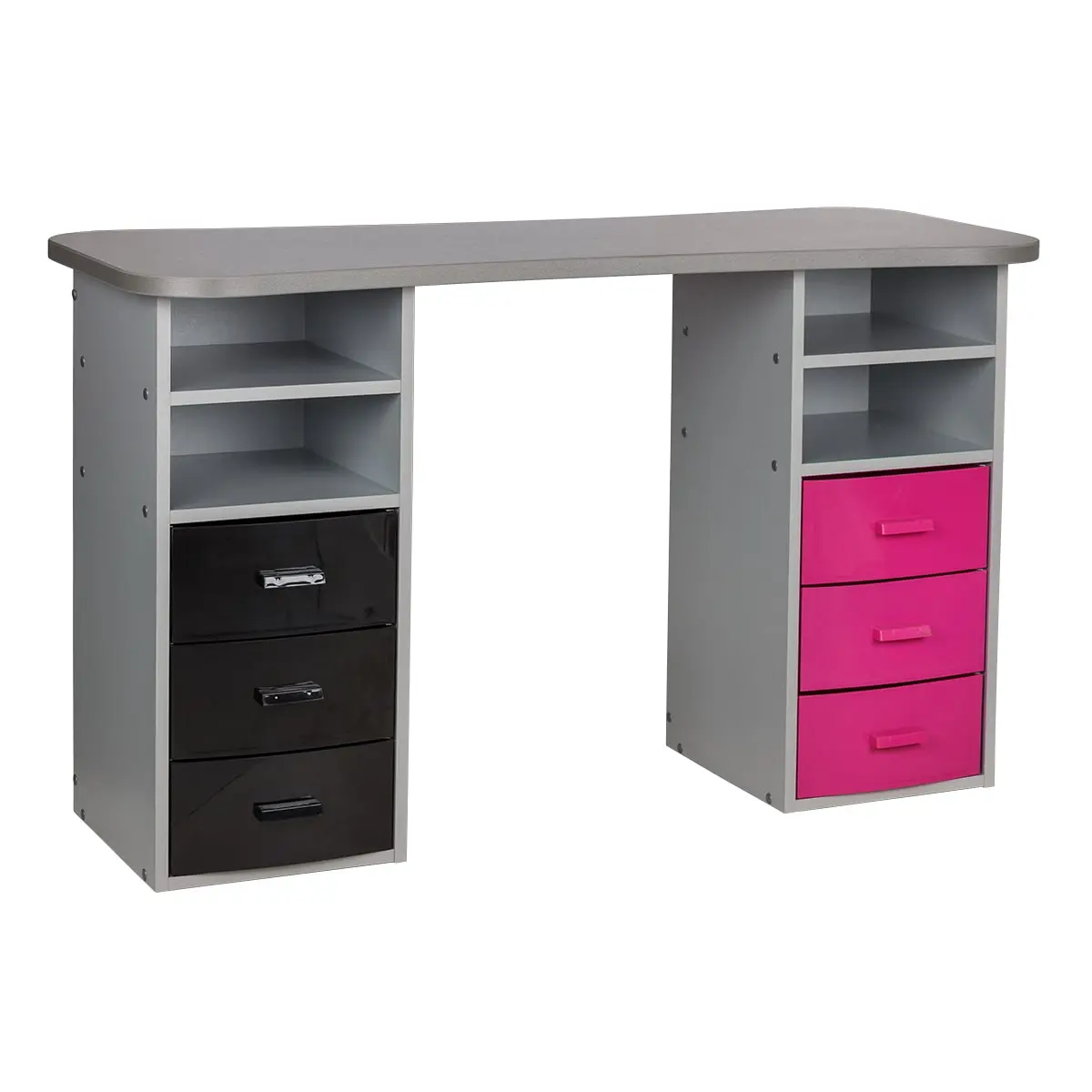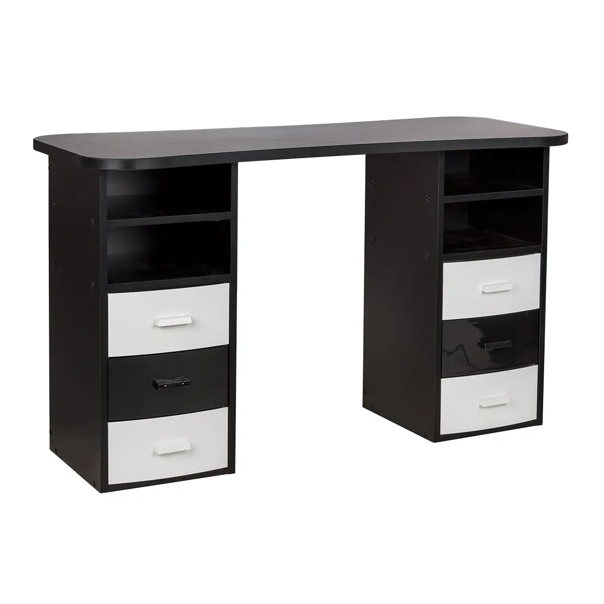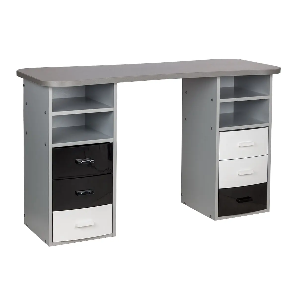 Столешница с плавными изгибами открывает легкий доступ к рукам клиента. На широких краях закругленной формы мастер может поставить аппарат, инструменты и расходные материалы. Под столешницей есть две тумбы по две ниши и по три ящика в каждой. При необходимости ящики можно вынимать.