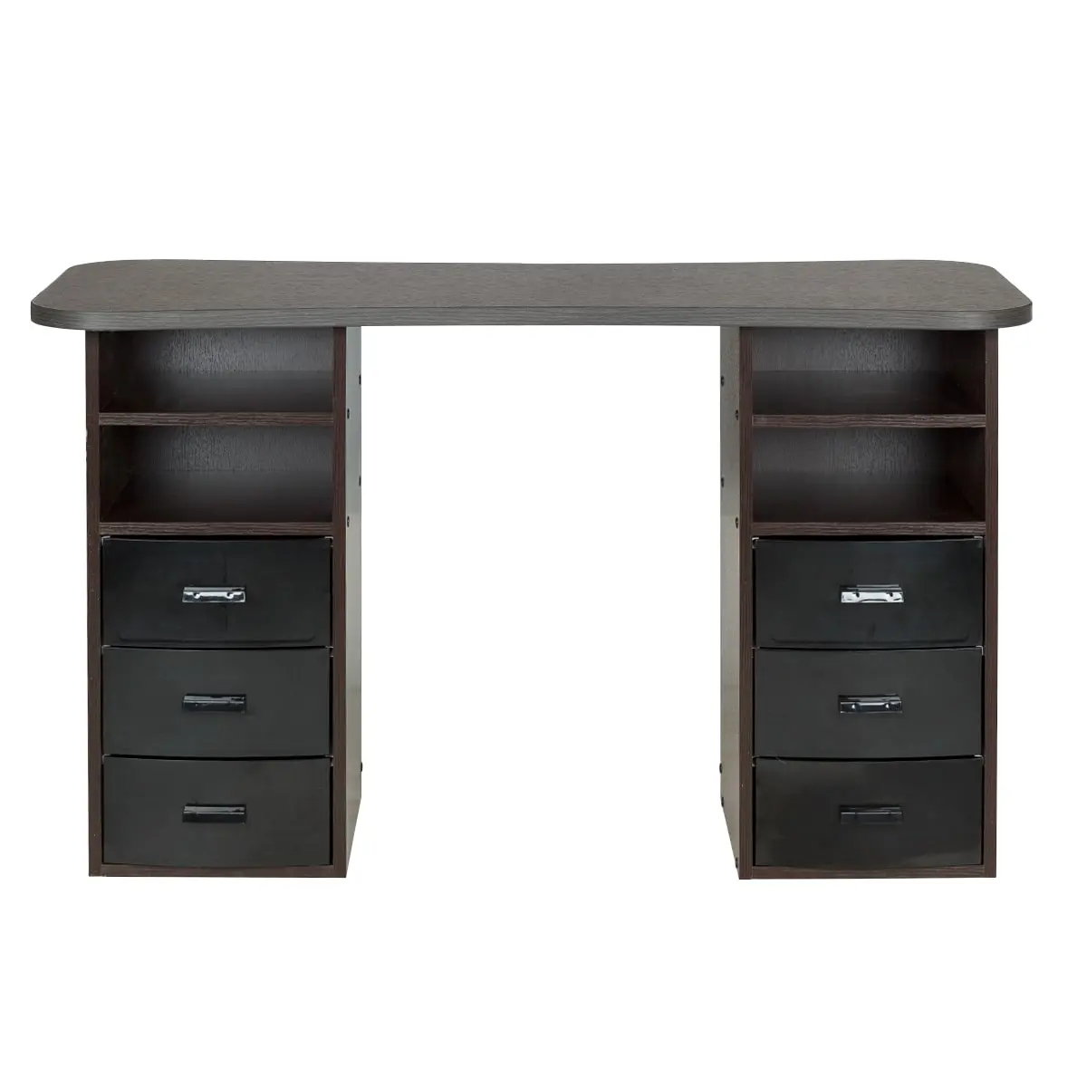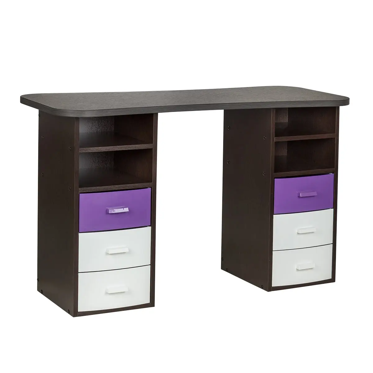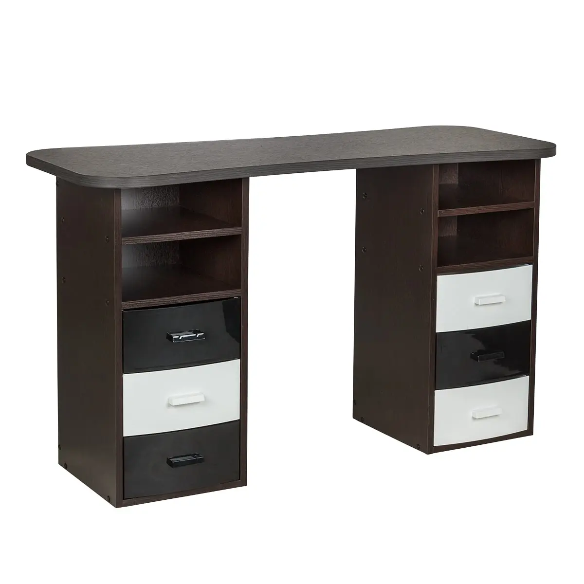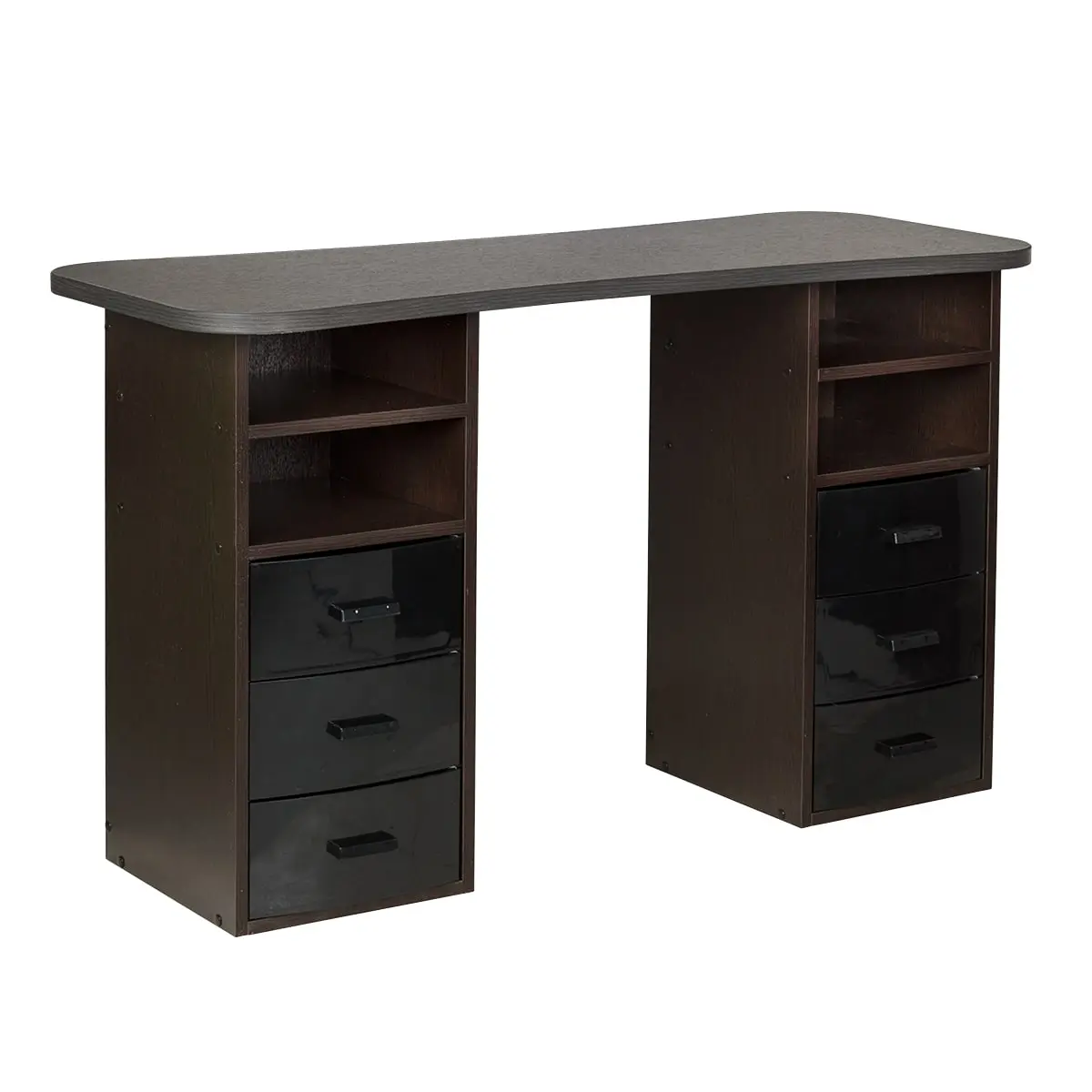 Столешница с плавными изгибами открывает легкий доступ к рукам клиента. На широких краях закругленной формы мастер может поставить аппарат, инструменты и расходные материалы. Под столешницей есть две тумбы по две ниши и по три ящика в каждой. При необходимости ящики можно вынимать.