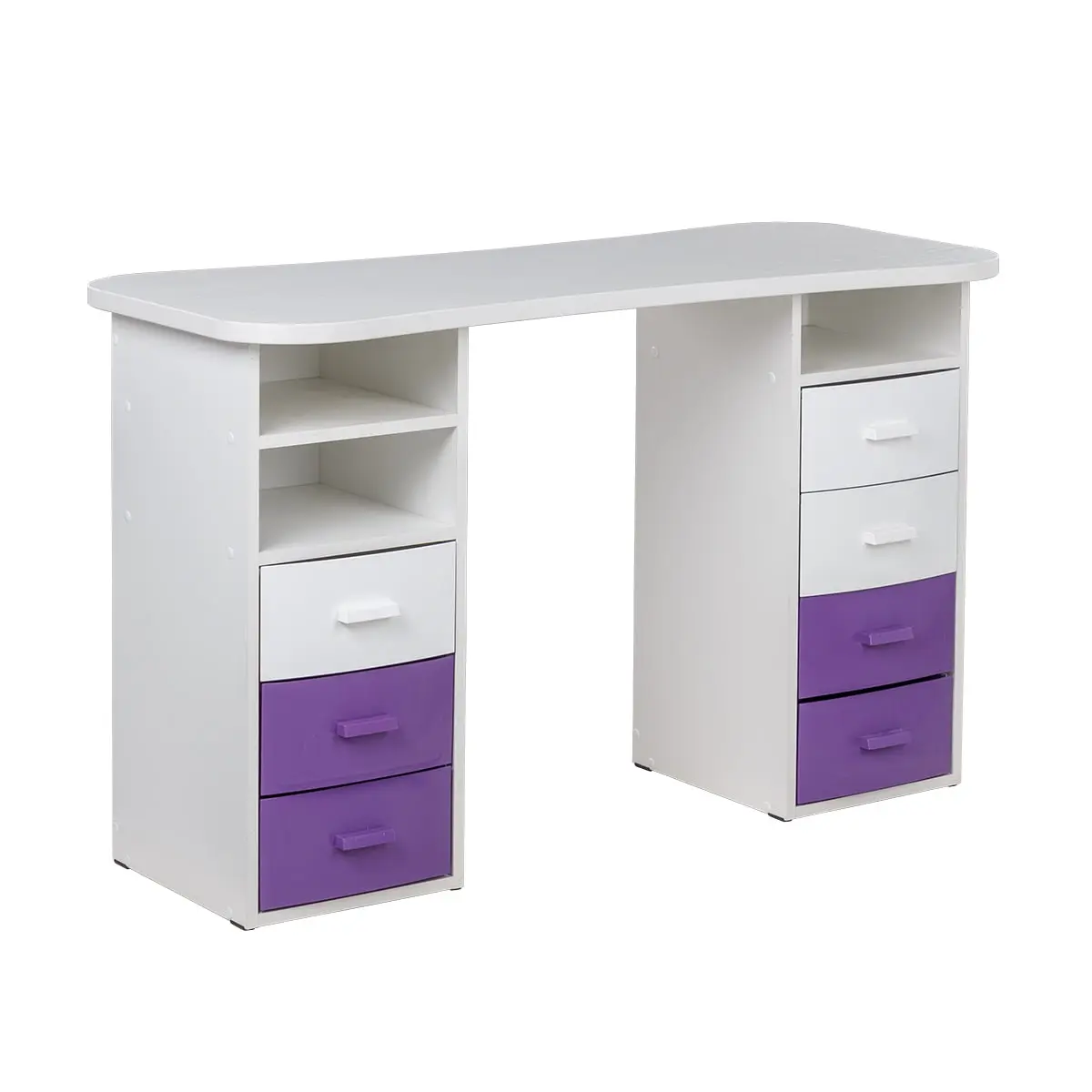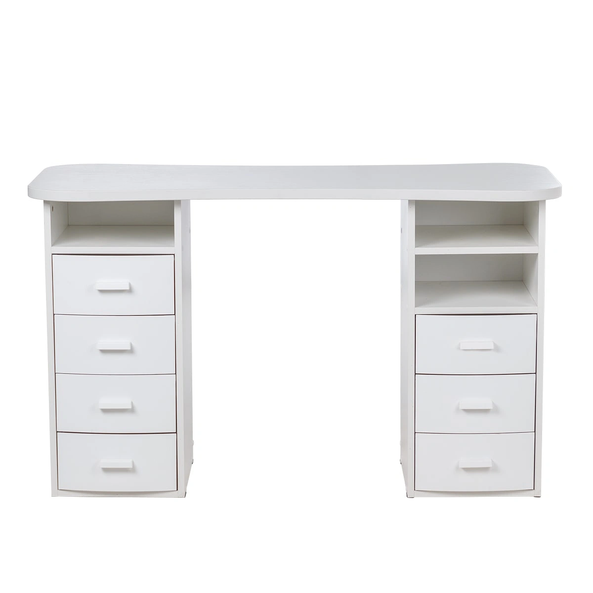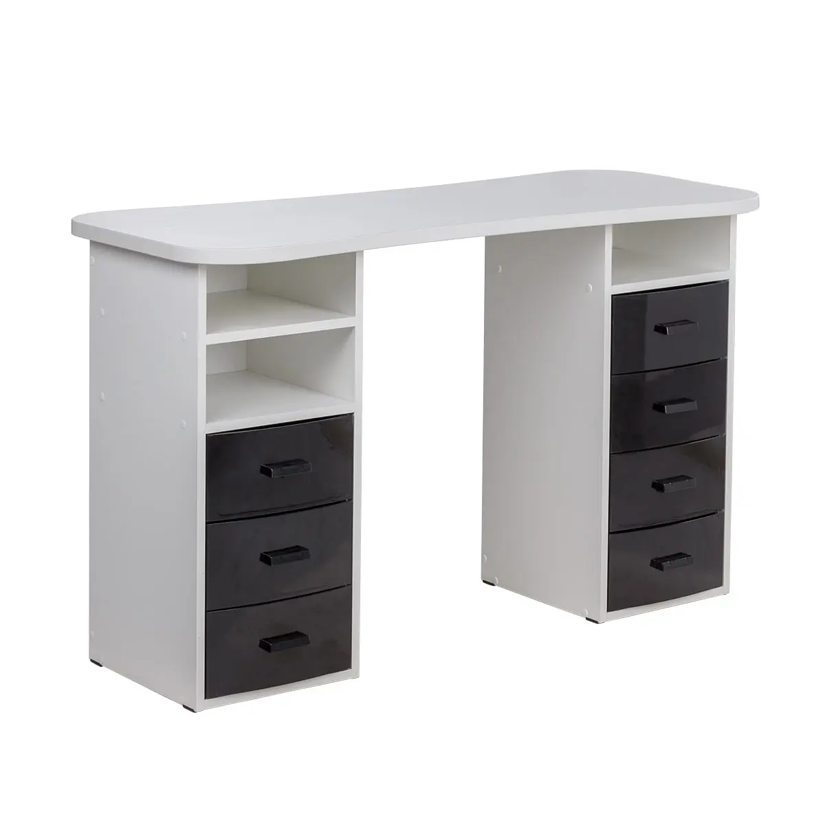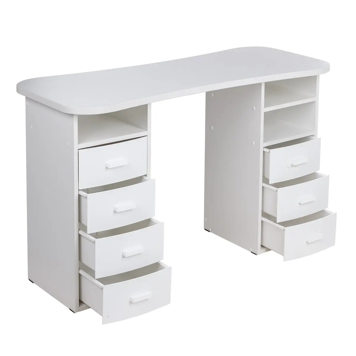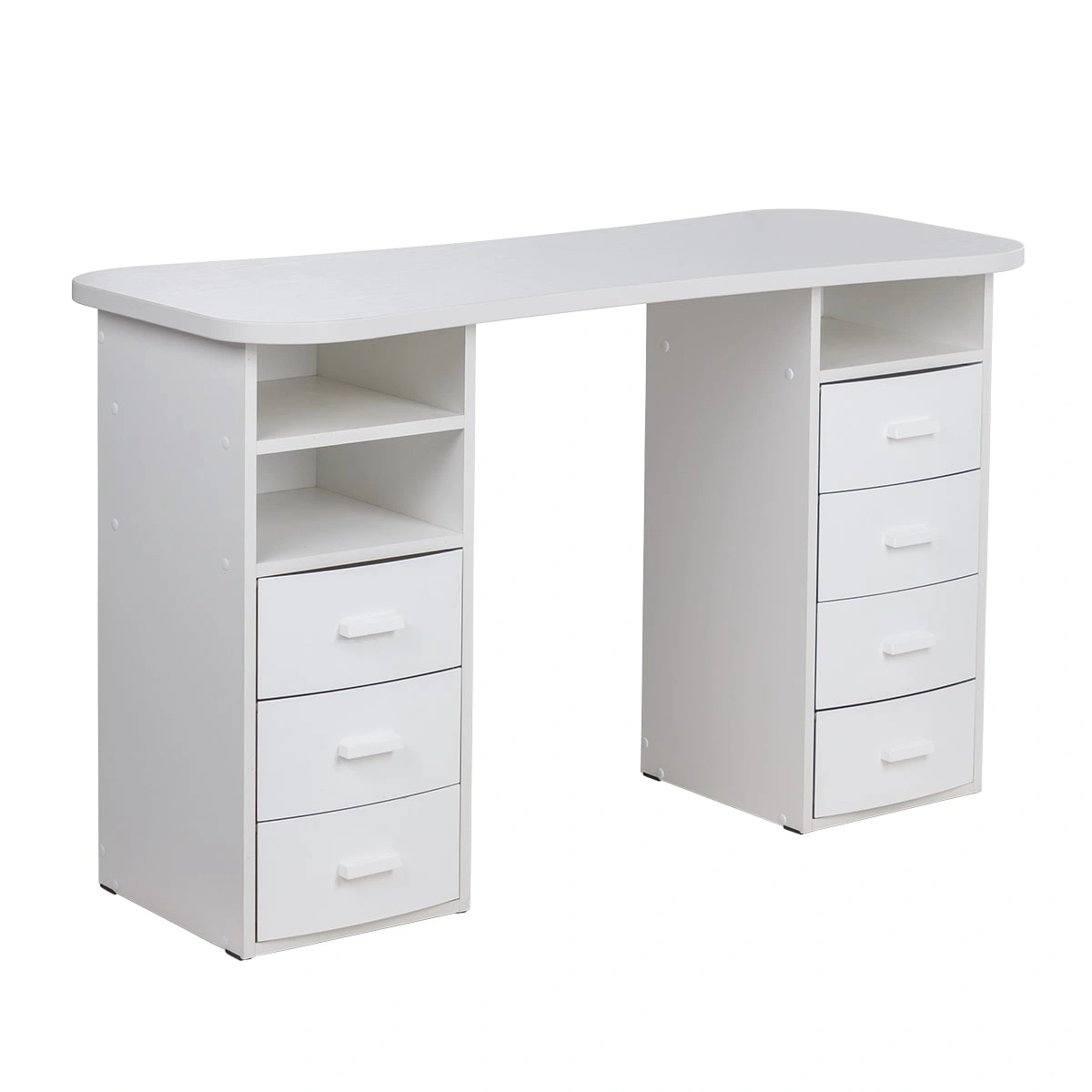 Столешница имеет плавные изгибы, благодаря чему открывается легкий доступ к рукам клиента. На широких краях достаточно места, чтобы поставить маникюрные аппараты и расходные материалы. Под столешницей есть две удобные тумбы с ящиками и открытыми полками для всех приспособлений мастера.