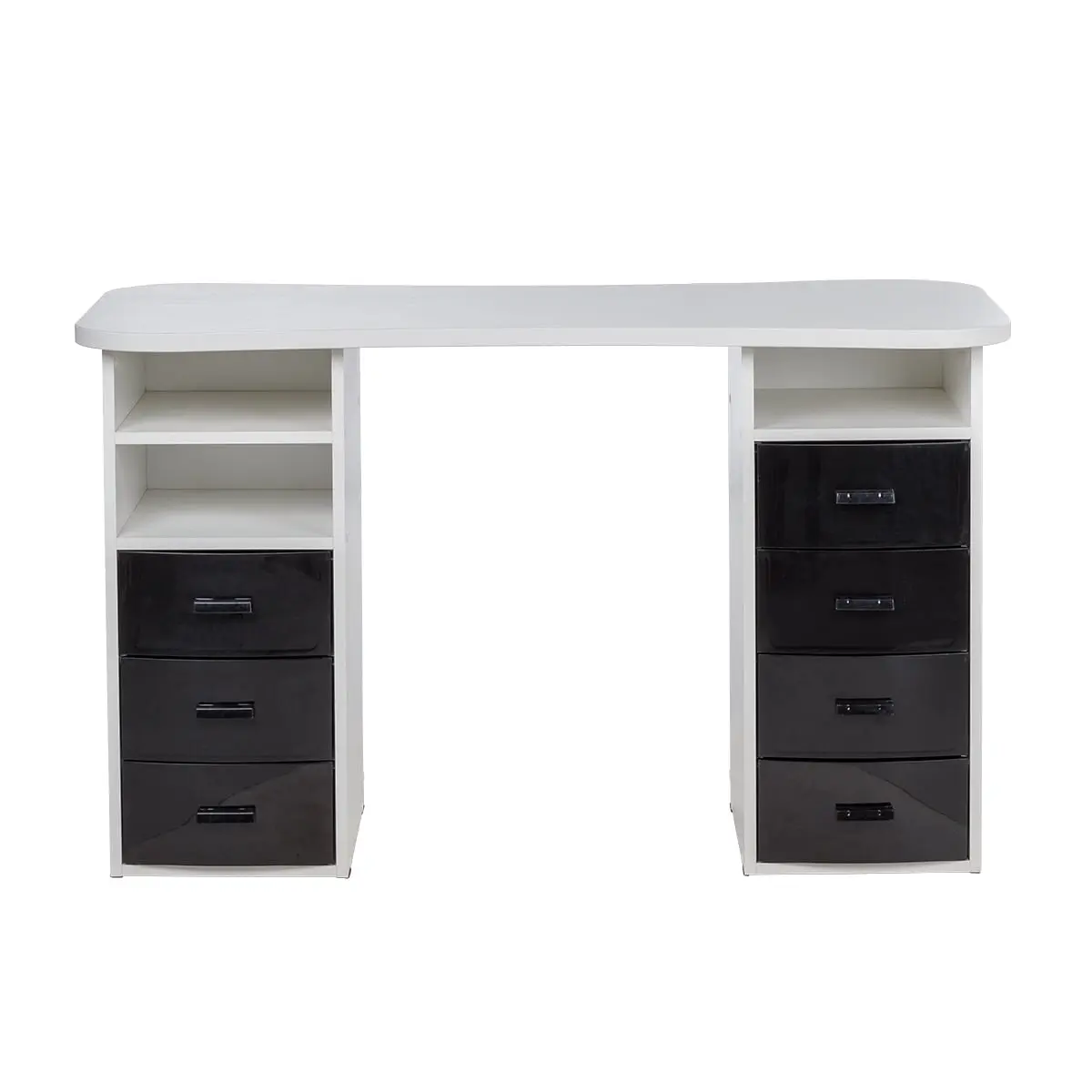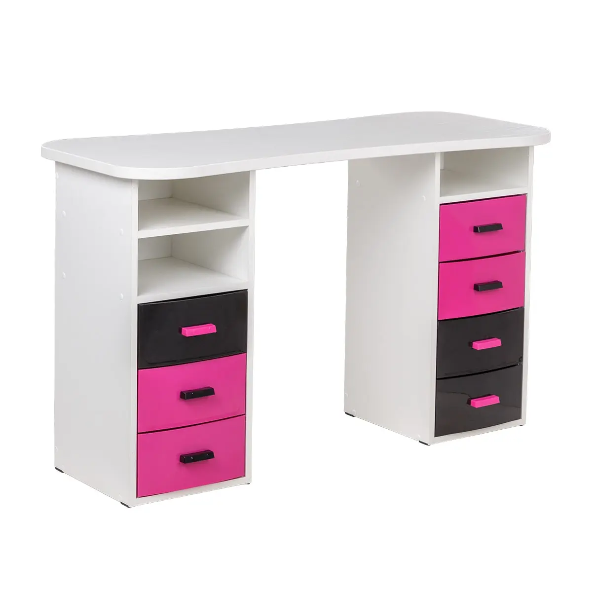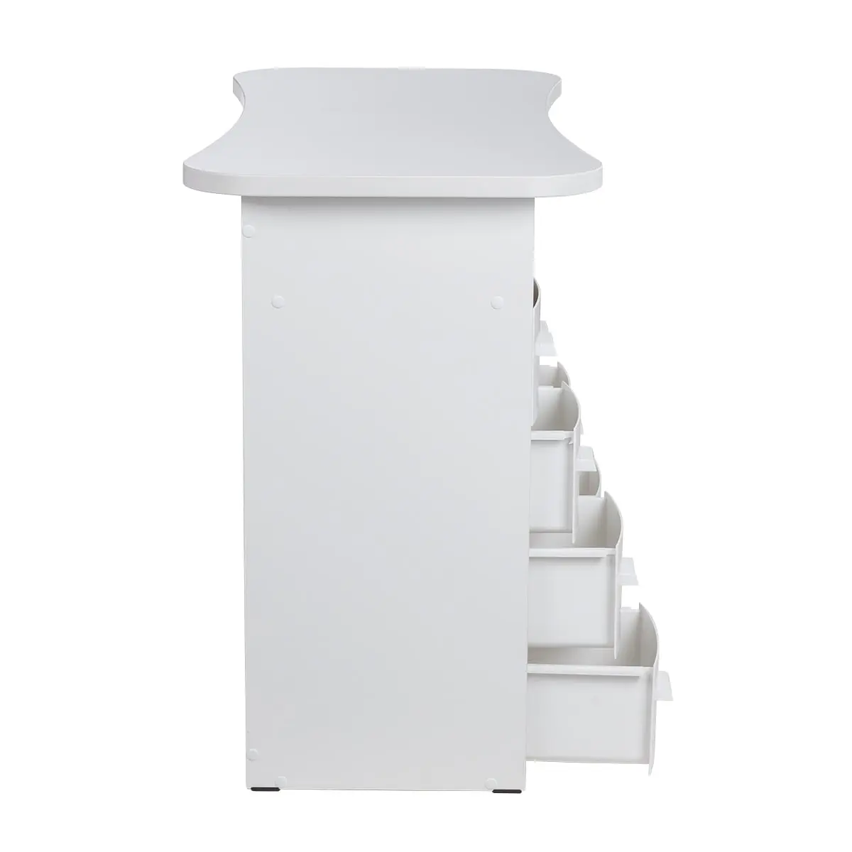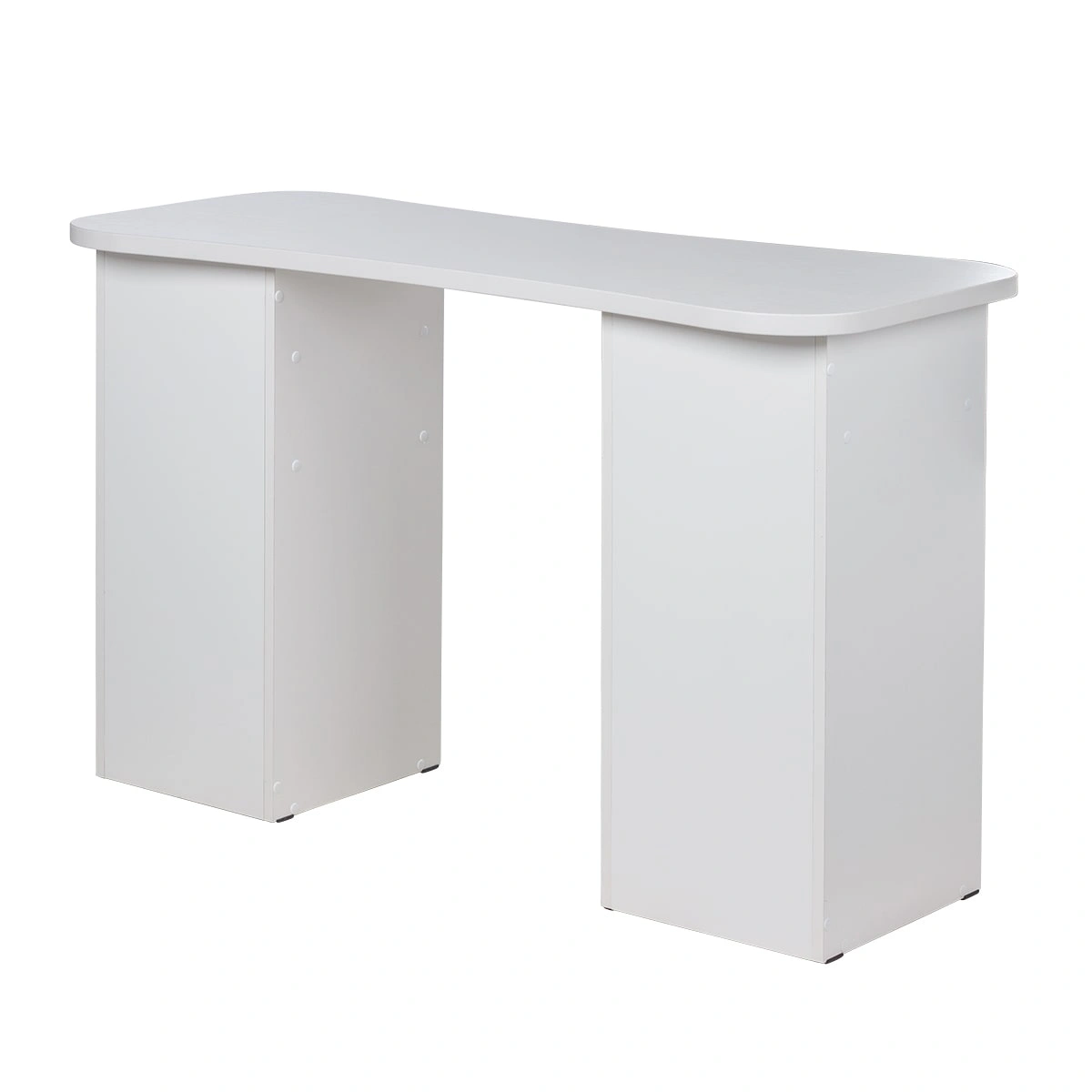 Столешница имеет плавные изгибы, благодаря чему открывается легкий доступ к рукам клиента. На широких краях достаточно места, чтобы поставить маникюрные аппараты и расходные материалы. Под столешницей есть две удобные тумбы с ящиками и открытыми полками для всех приспособлений мастера.