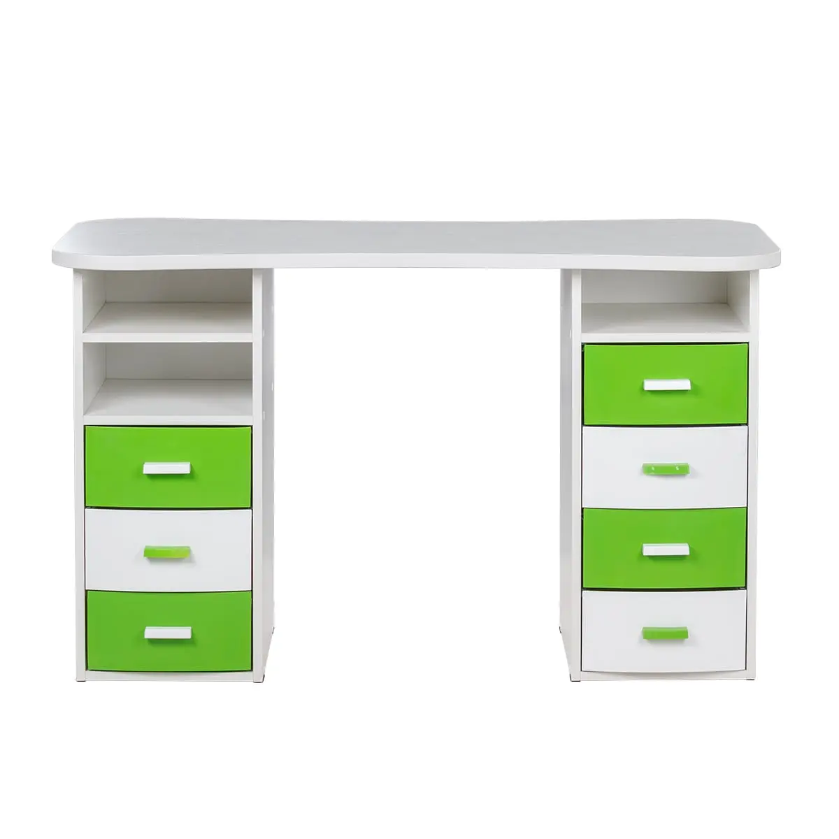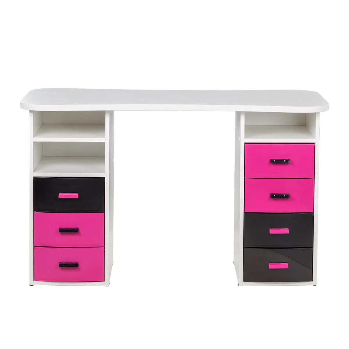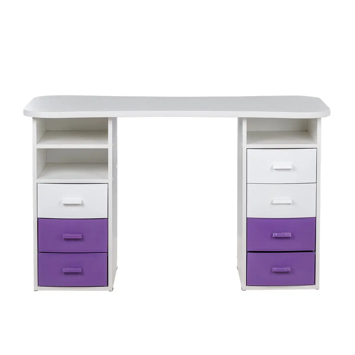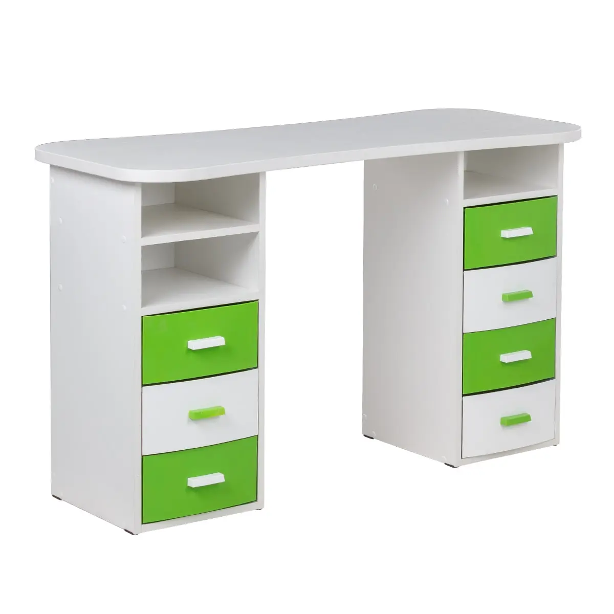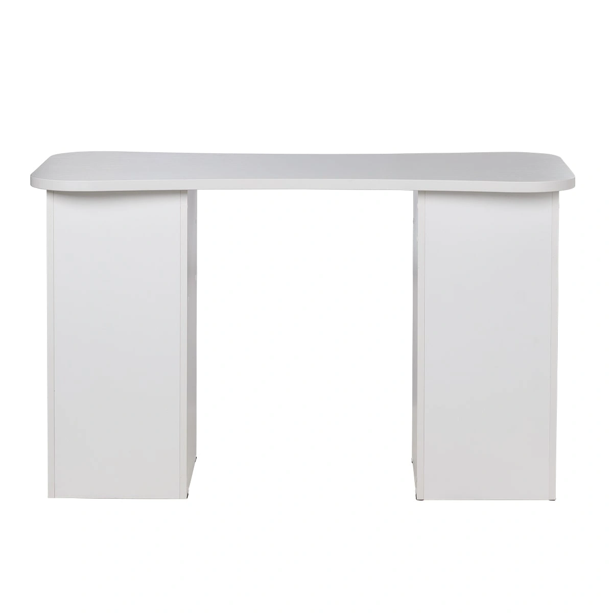 Столешница имеет плавные изгибы, благодаря чему открывается легкий доступ к рукам клиента. На широких краях достаточно места, чтобы поставить маникюрные аппараты и расходные материалы. Под столешницей есть две удобные тумбы с ящиками и открытыми полками для всех приспособлений мастера.