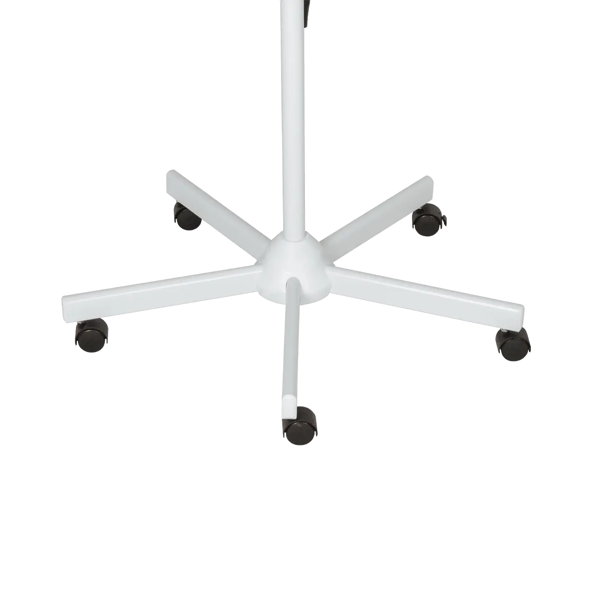 Стойка имеет металлическую конструкцию на колесиках и подходит для оснащения медицинских и косметологических кабинетов, а также ювелирных и часовых мастерских. Напольная стойка для вытяжки 4blanc оснащена крестовиной из 5 лучей, что обеспечивает высокую устойчивость и безопасность в работе, а также фиксатором на колесах, что позволяет закрепить штатив напольный в одном положении без опрокидывания.