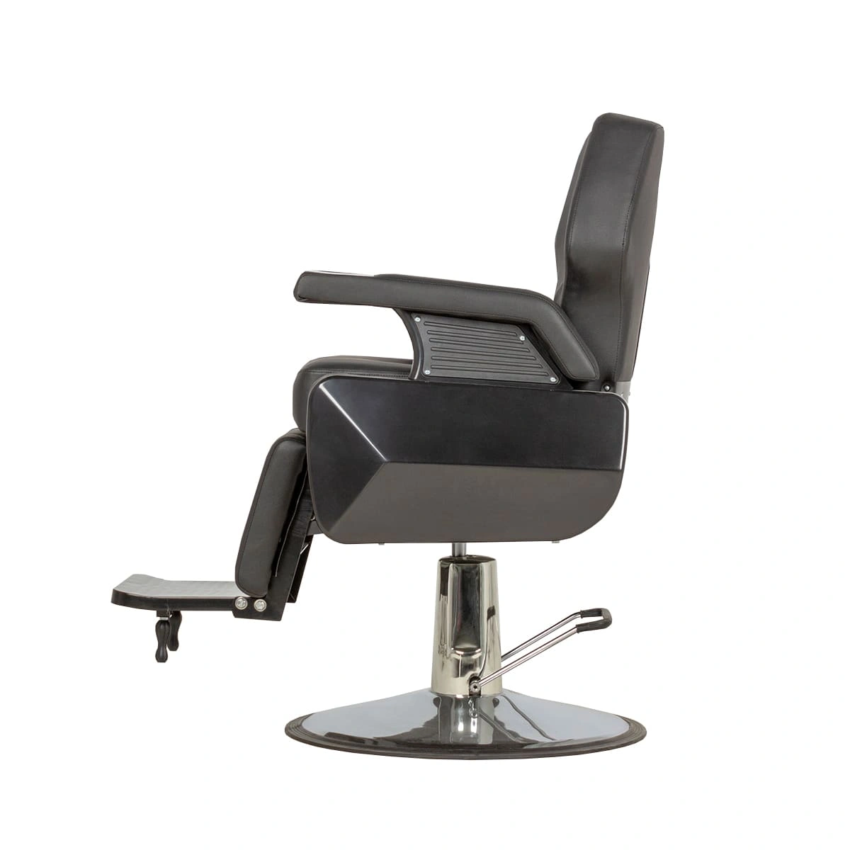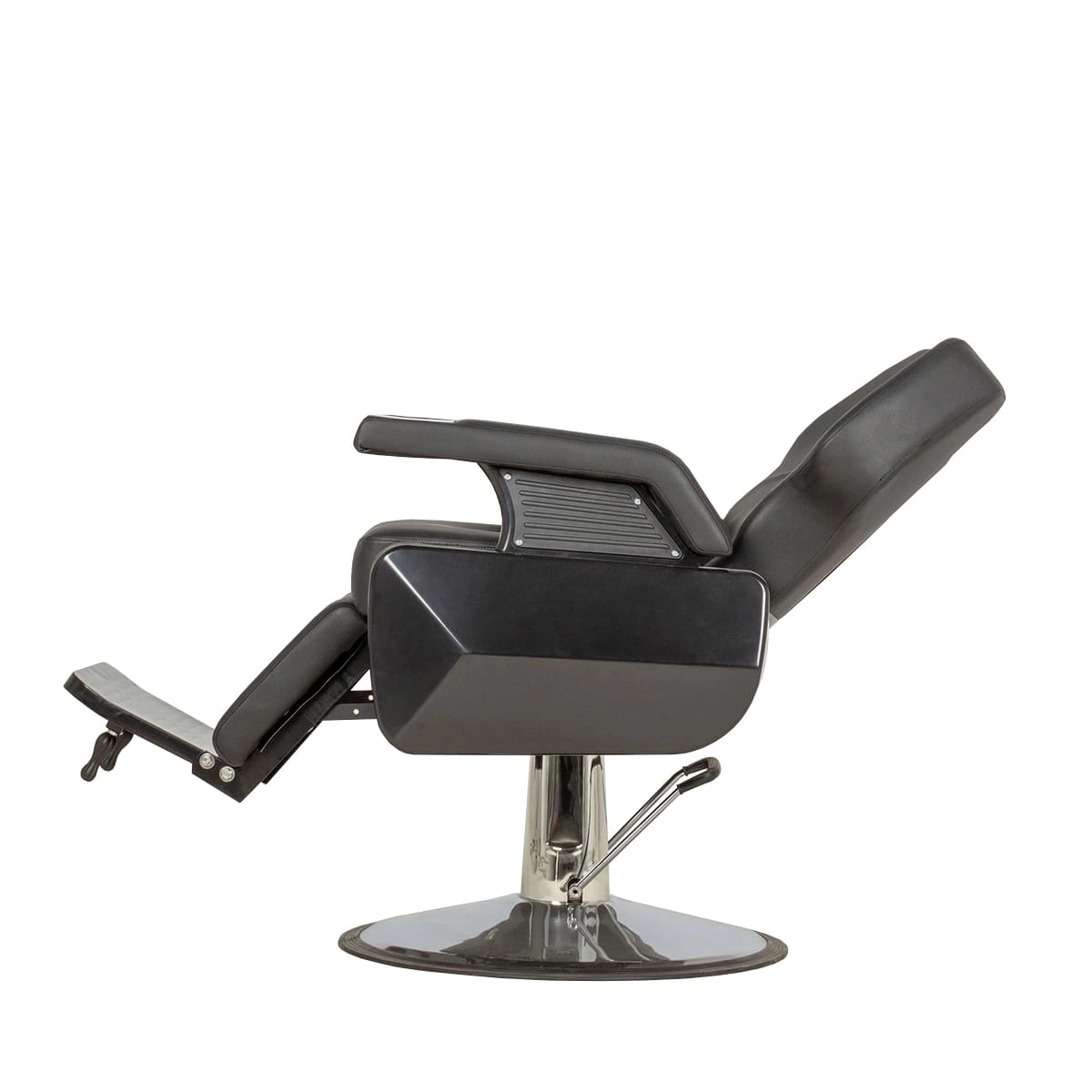 Массивное кресло оснащено удобными подлокотниками и мягким подголовником. Широкое посадочное место обеспечит комфорт во время проведения процедур. Практичная подножка предотвратит усталость ног клиентов.