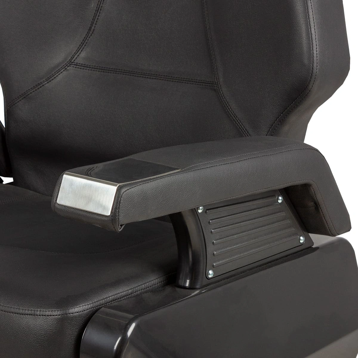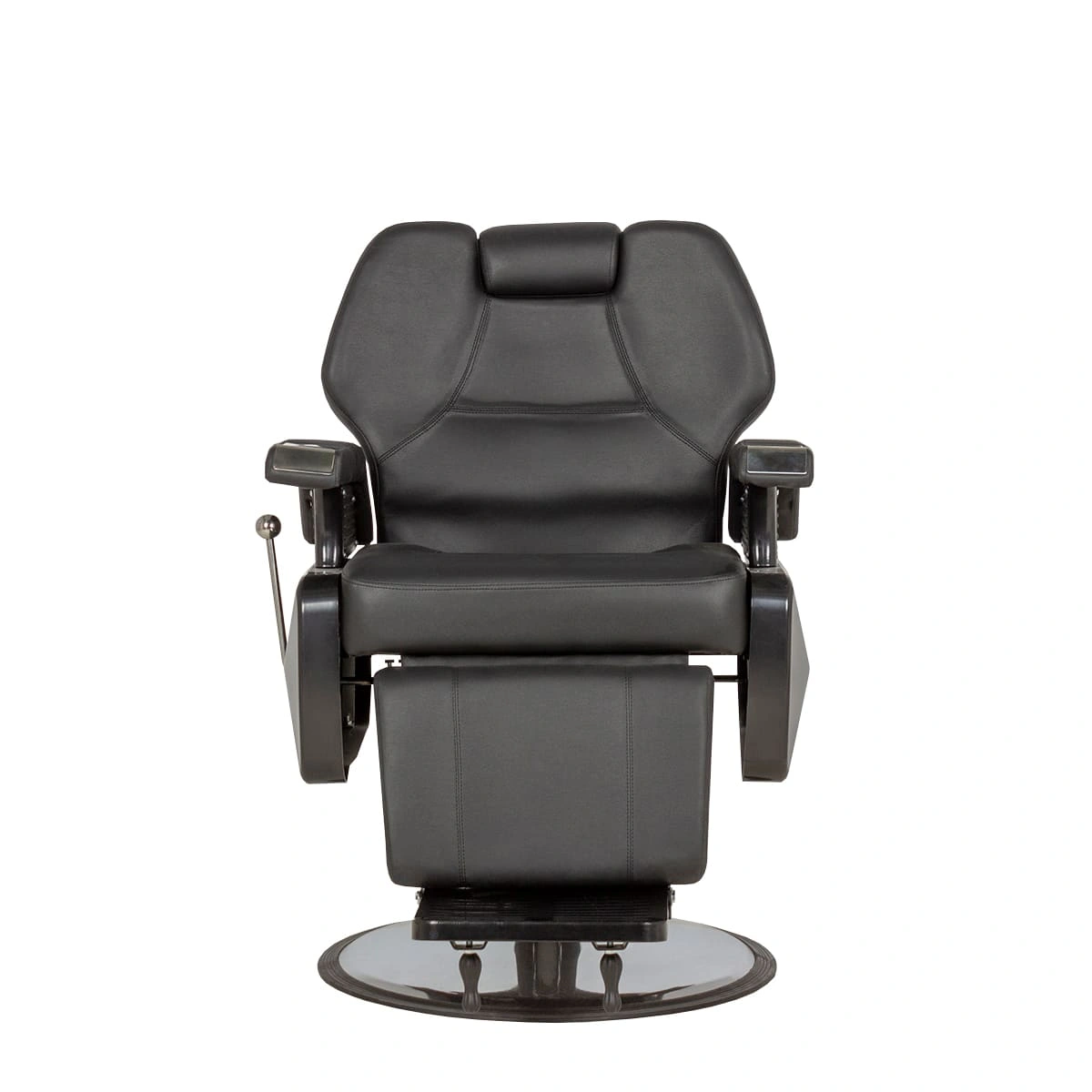 В основании оборудования хромированный стальной диск с резиновым кантом, что обеспечивает защиту напольного покрытия. Каркас изготовлен из металла и многослойной фанеры. Благодаря тяжелой основе и стальному каркасу, кресло устойчиво в любом положении. Хромированные элементы также устойчивы к воздействию влаги и косметических средств. Подлокотники выполнены из ударопрочного пластика. В качестве обивки использована износостойкая экокожа. Материал не подвергается царапинам, не впитывает загрязнения и долго сохраняет красивый внешний вид.