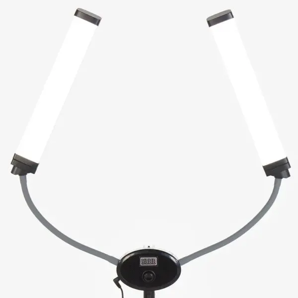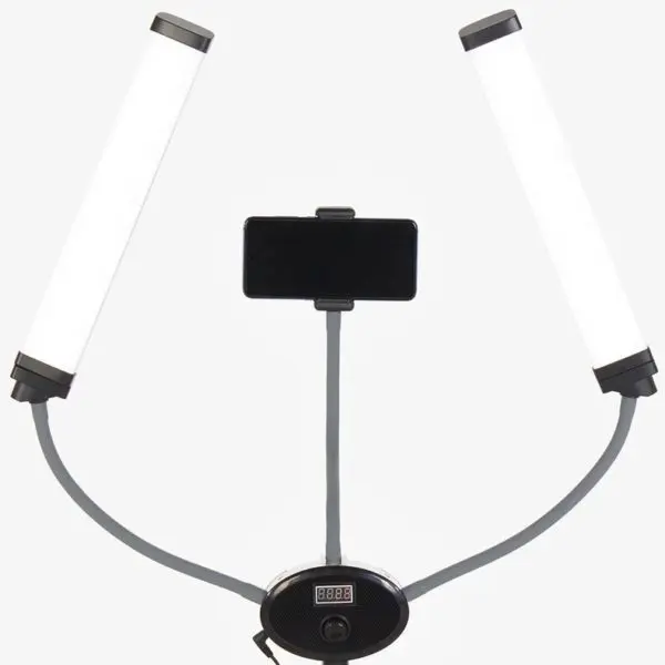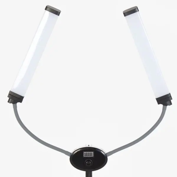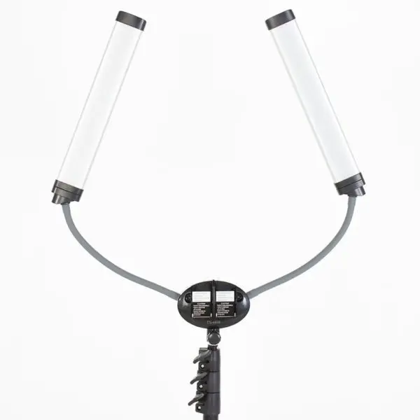 Конструкция лампы - два симметрично расположенных светильника на гнущейся основе. Компактная лампа позволяет настраивать оптимальный уровень света и фиксировать любой угол наклона. С помощью гибкого кронштейна можно снимать интересные видео процесса работы. Благодаря удобному штативу можно регулировать высоту лампы. Тренога легко собирается и разбирается. В комплекте есть практичная сумка, с помощью которой можно транспортировать и хранить оборудование.
