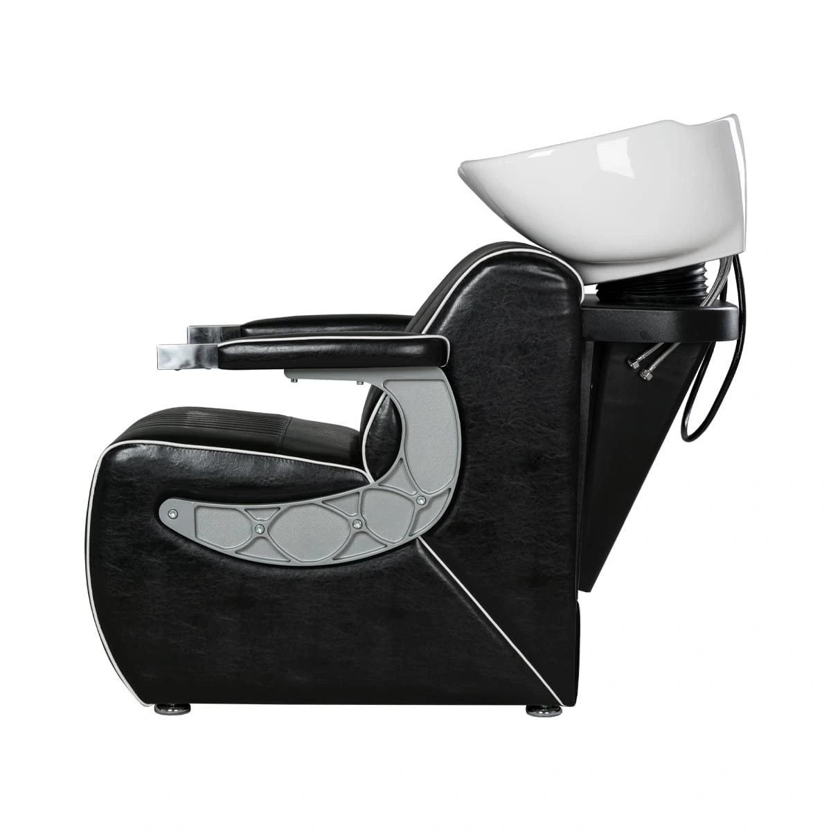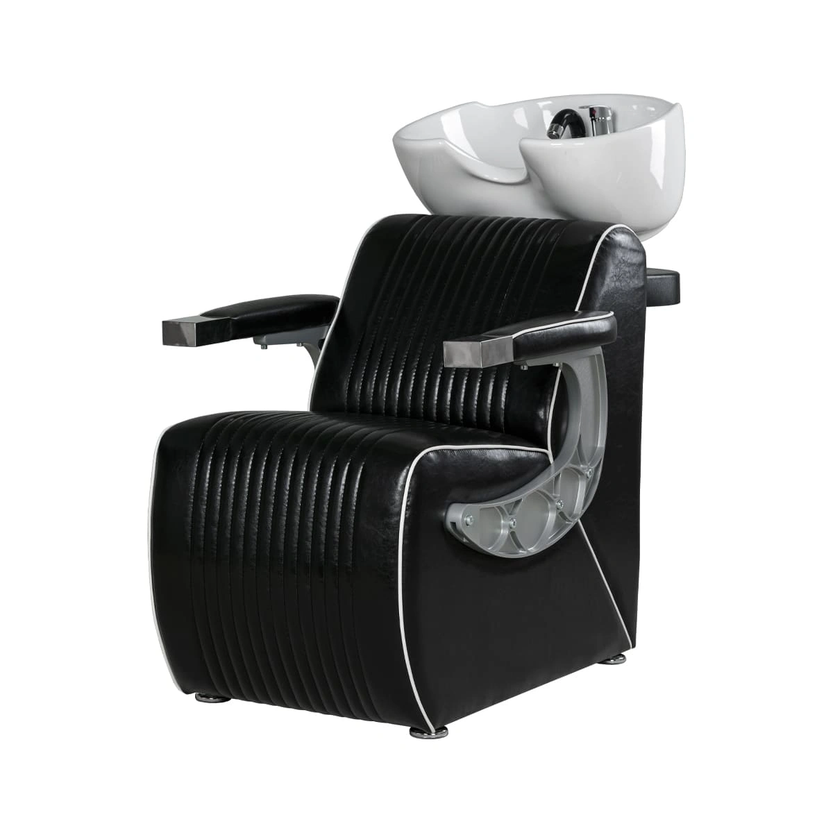 Комплектация мойки: раковина, сантехнические комплектующие, узел наклона раковины, каркас мойки, кресло, хромированные подлокотники с накладками под цвет кресла.