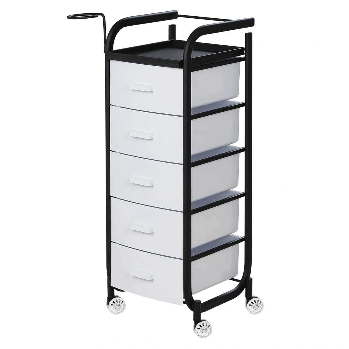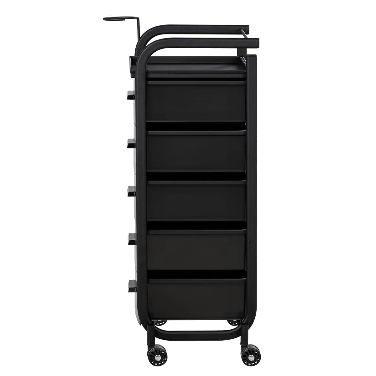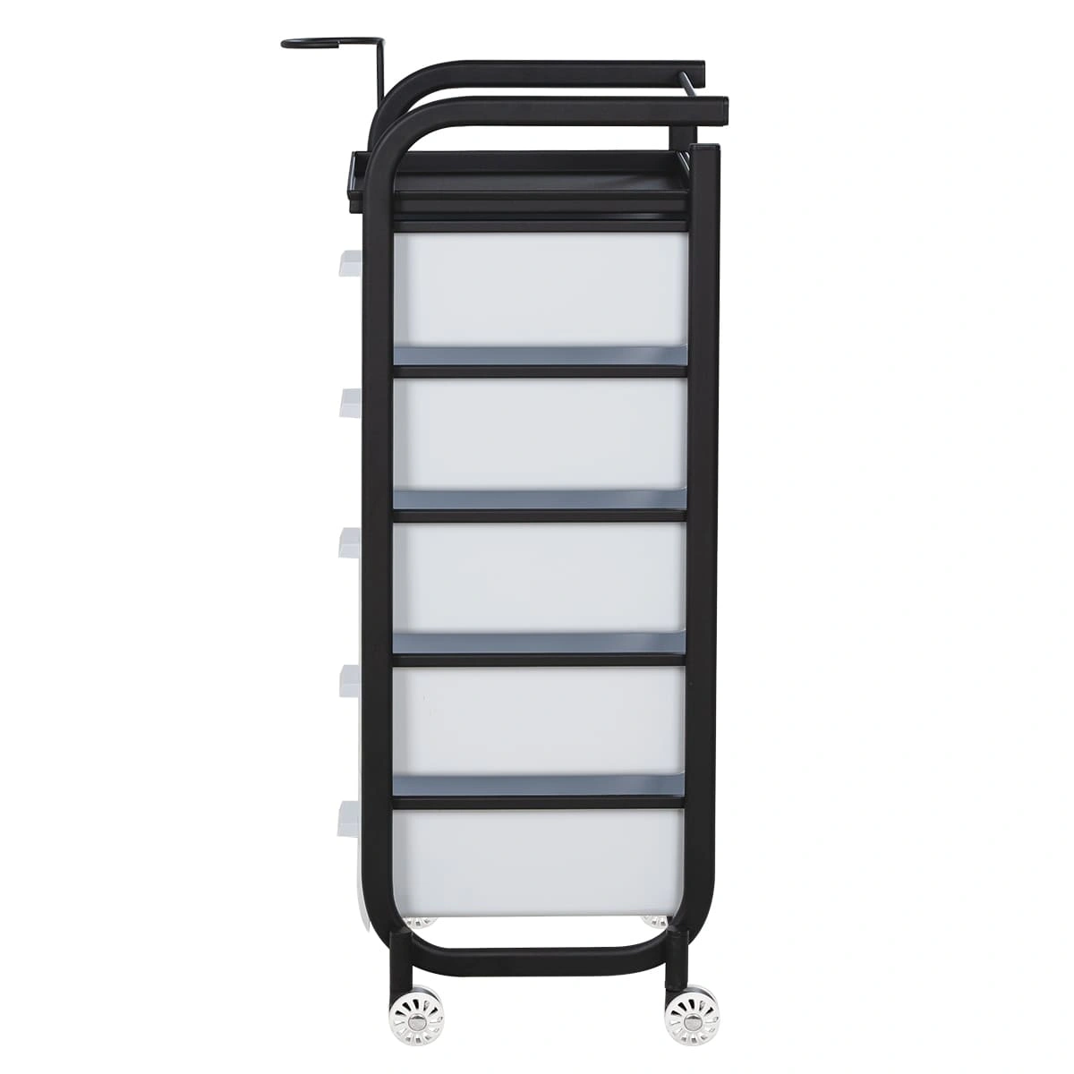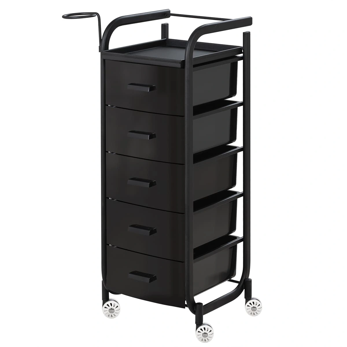 Для принадлежностей в парикмахерской тележке есть пять выдвижных закрытых ящиков, обеспечивающих защиту от влаги, пыли, волос и красящих элементов. Верхняя металлическая крышка — пространство для инструментов и баночек красоты, она позволит мастеру держать под рукой все необходимое во время работы с клиентом. Также модель оснащена фенодержателем.