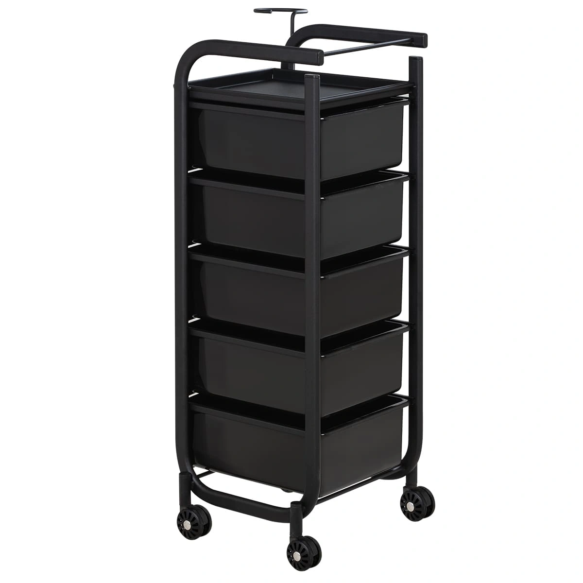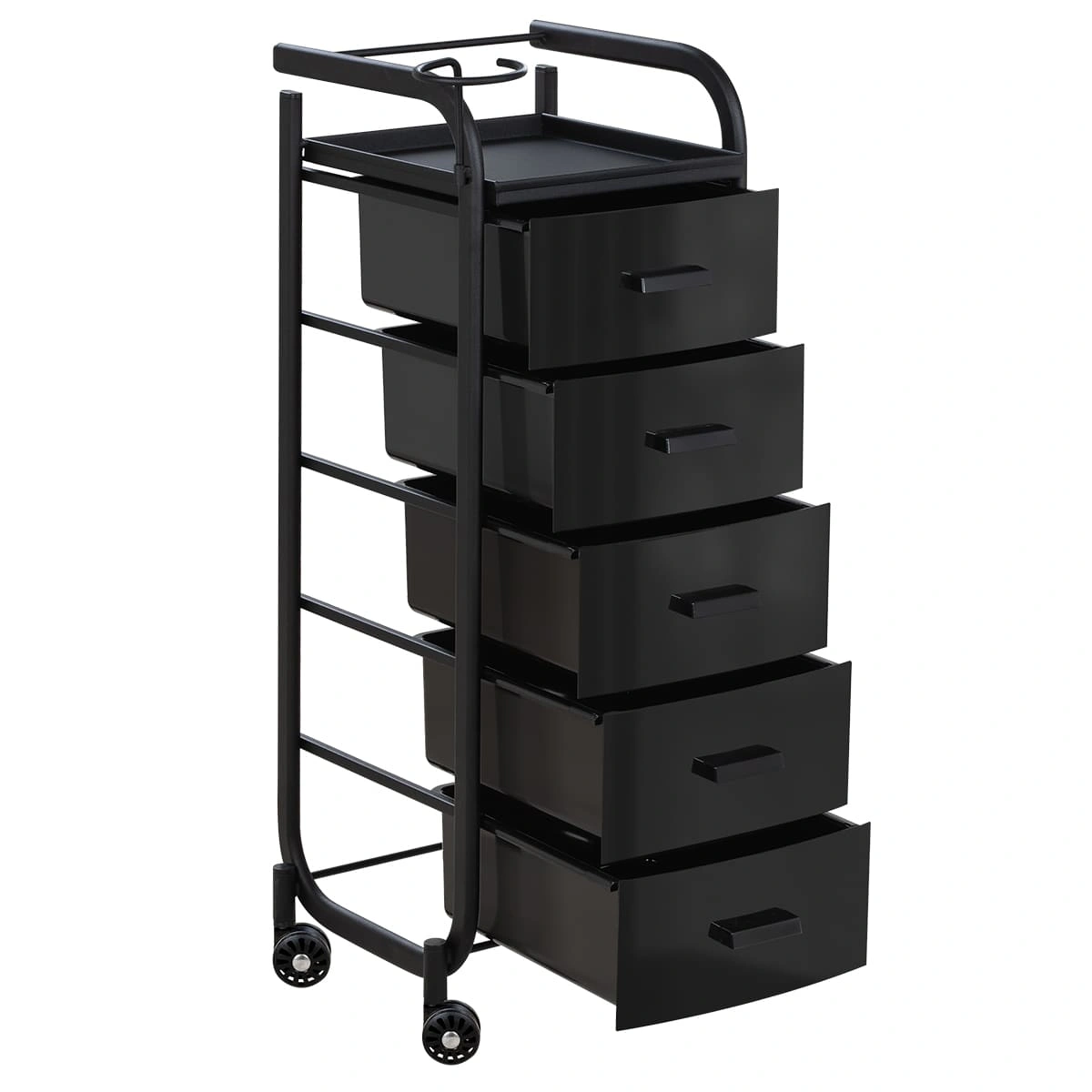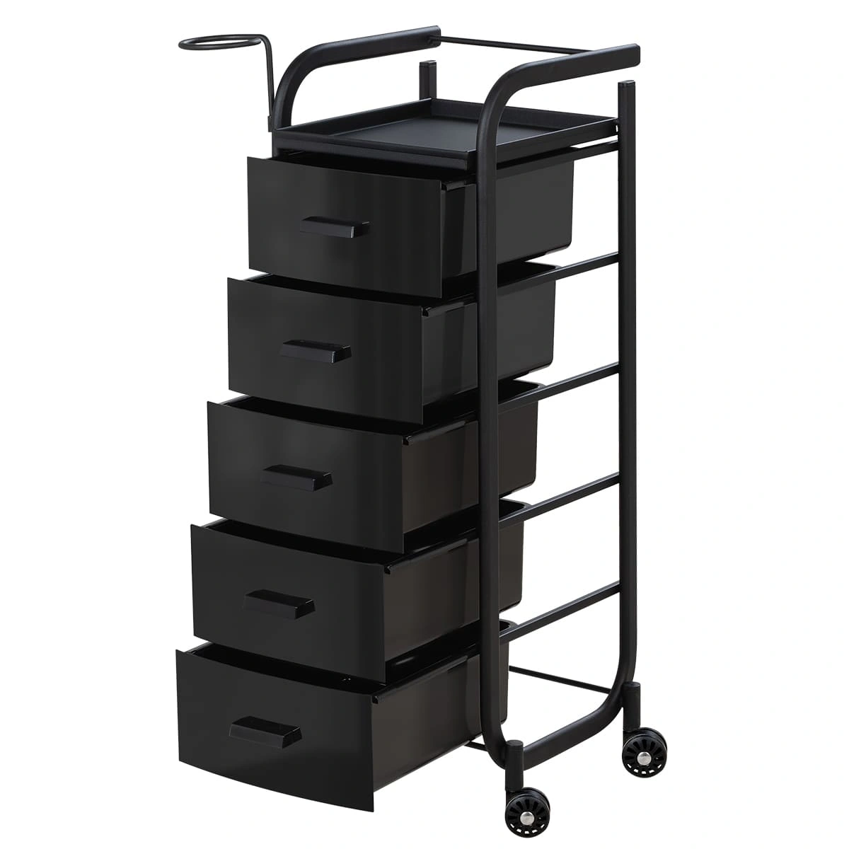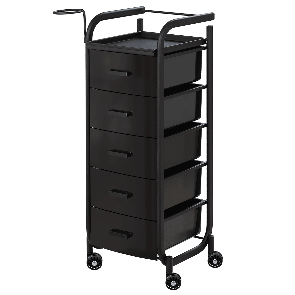 Для принадлежностей в парикмахерской тележке есть пять выдвижных закрытых ящиков, обеспечивающих защиту от влаги, пыли, волос и красящих элементов. Верхняя металлическая крышка — пространство для инструментов и баночек красоты, она позволит мастеру держать под рукой все необходимое во время работы с клиентом. Также модель оснащена фенодержателем.