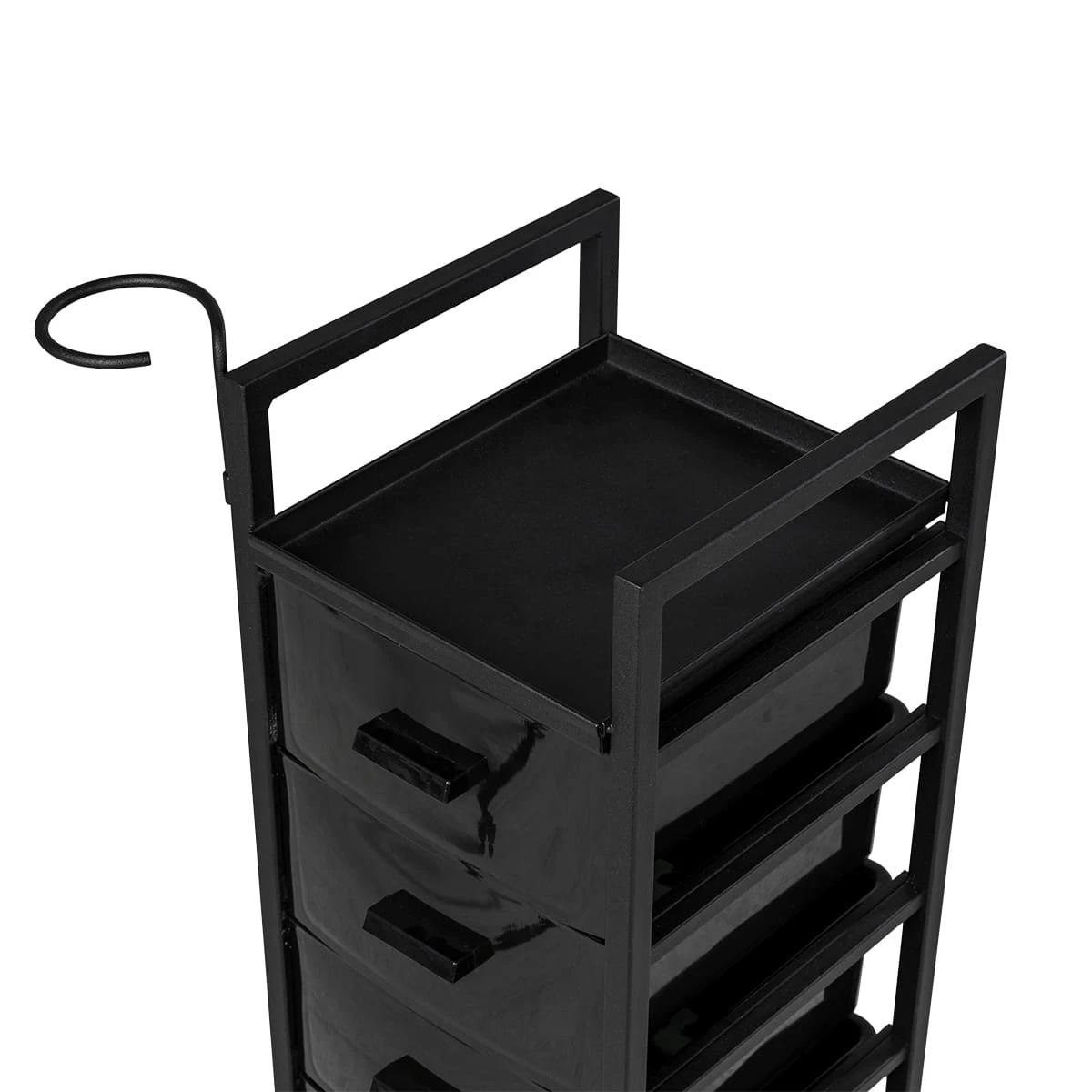 Для принадлежностей в парикмахерской тележке есть пять выдвижных ящиков. Верхняя полка позволит мастеру держать под рукой инструменты, необходимые во время работы с клиентом. На боковине установлен практичный фенодержатель. Вращающиеся колесики обеспечивают плавное и практически бесшумное перемещение оборудования в пределах рабочей зоны.