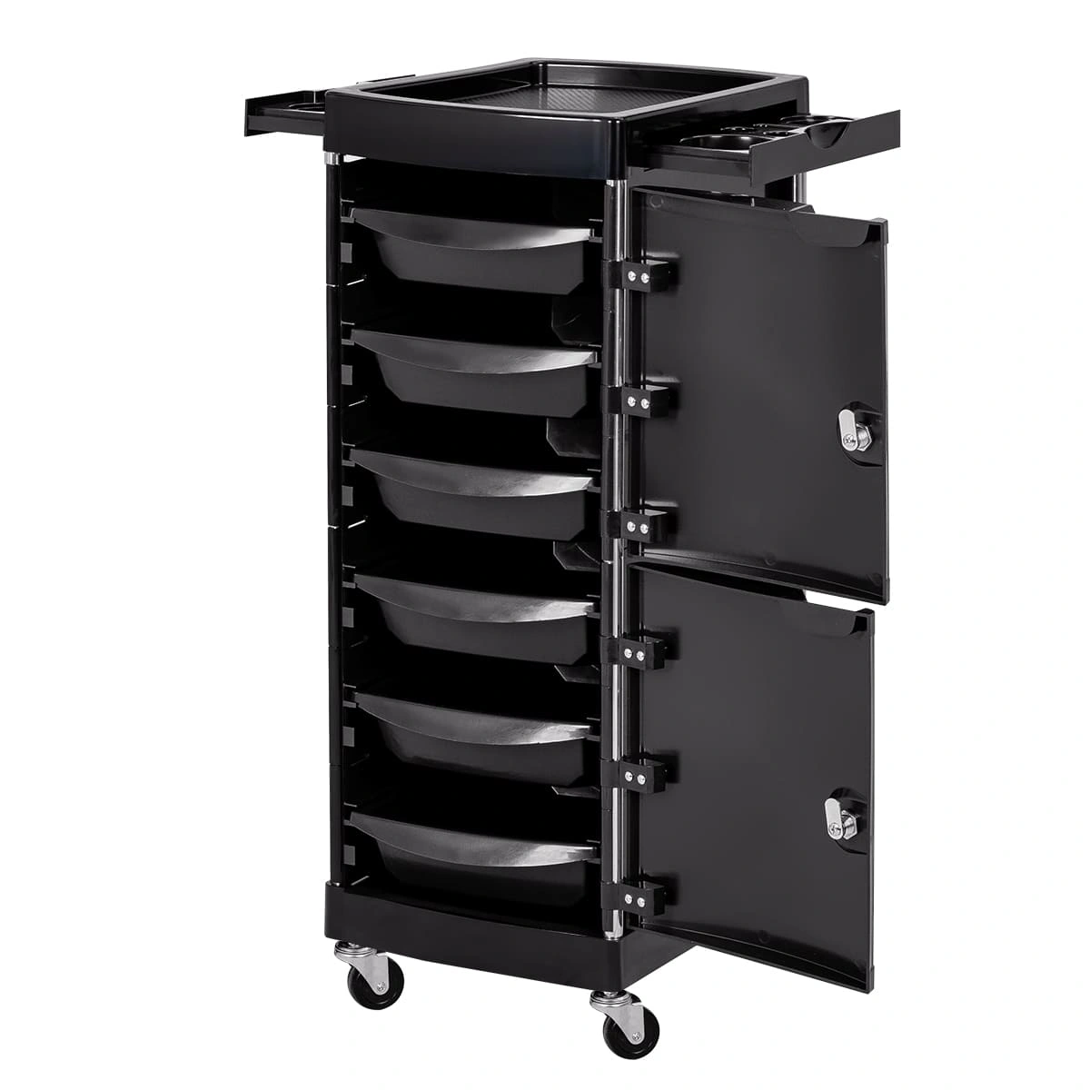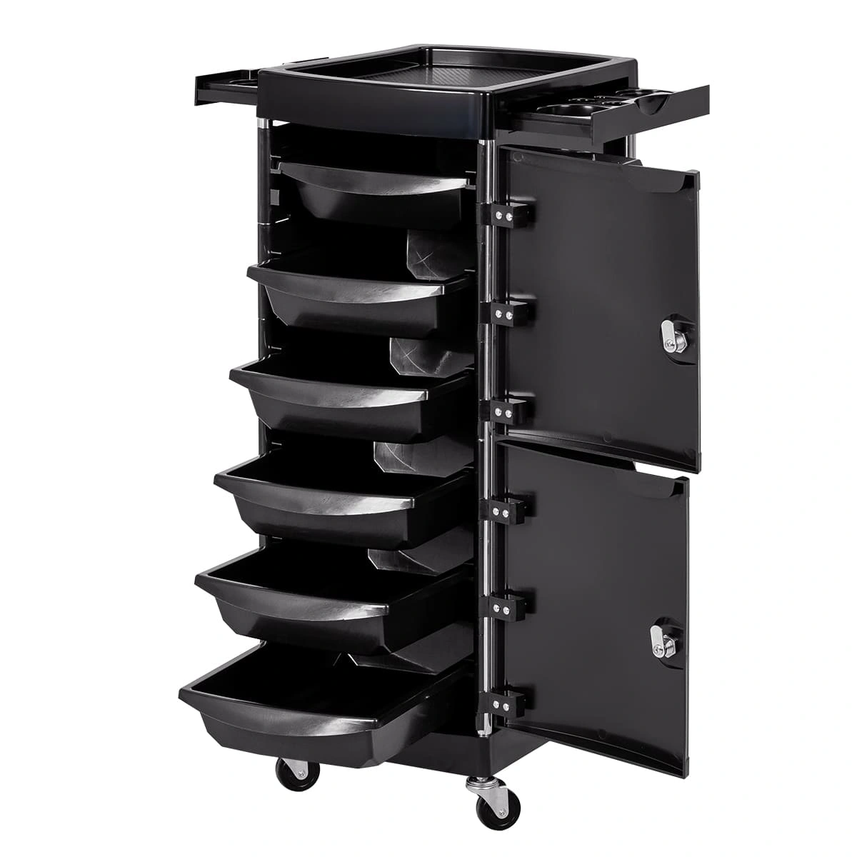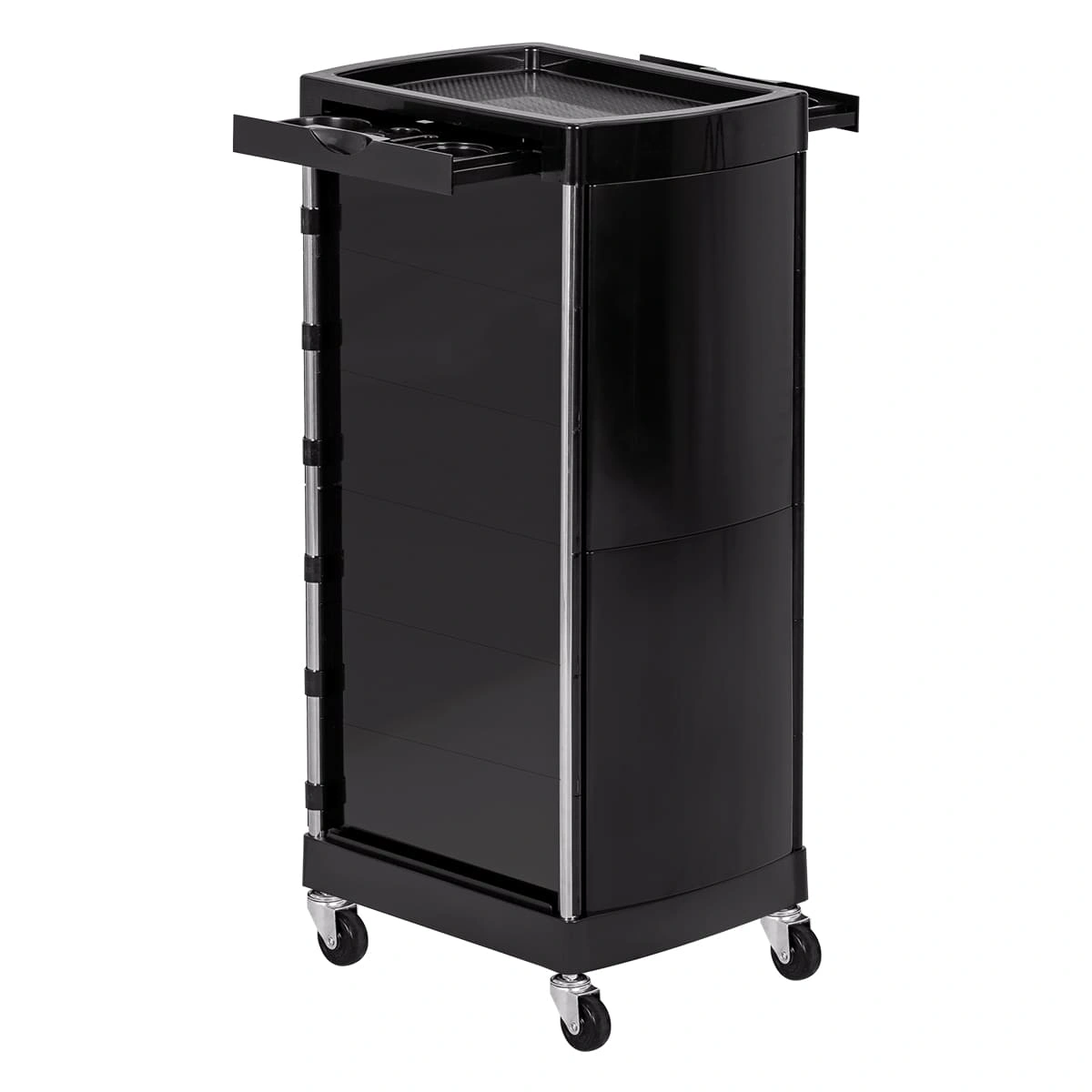 Парикмахерское оборудование изготовлено из качественных материалов. Тележка установлена на прочный металлический каркас. Для создания полочек, ящиков, закрытых боковин использован ударопрочный пластик.