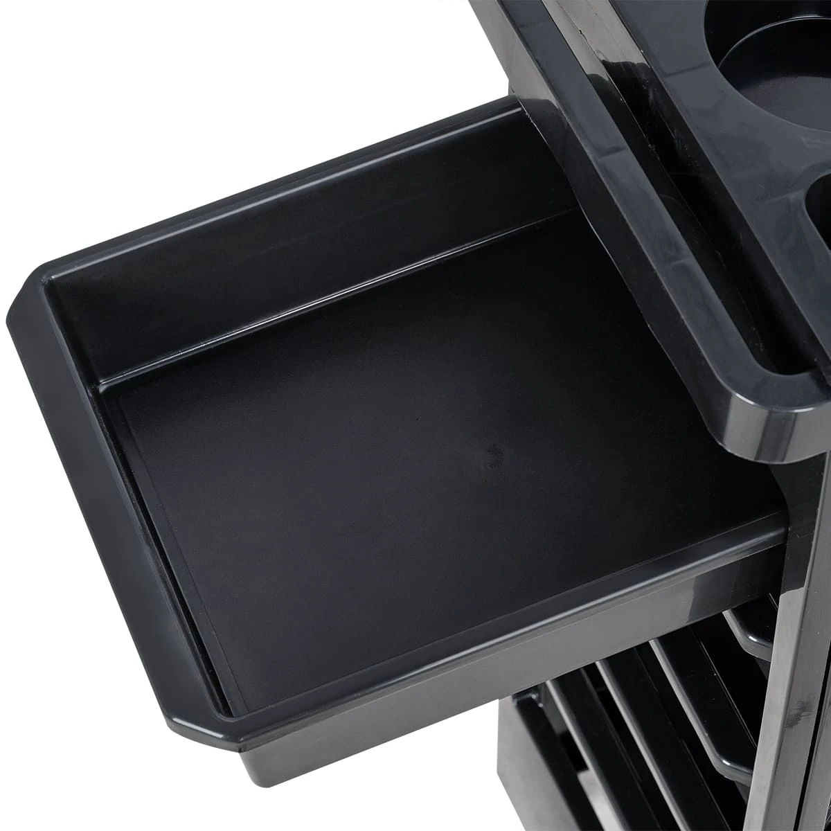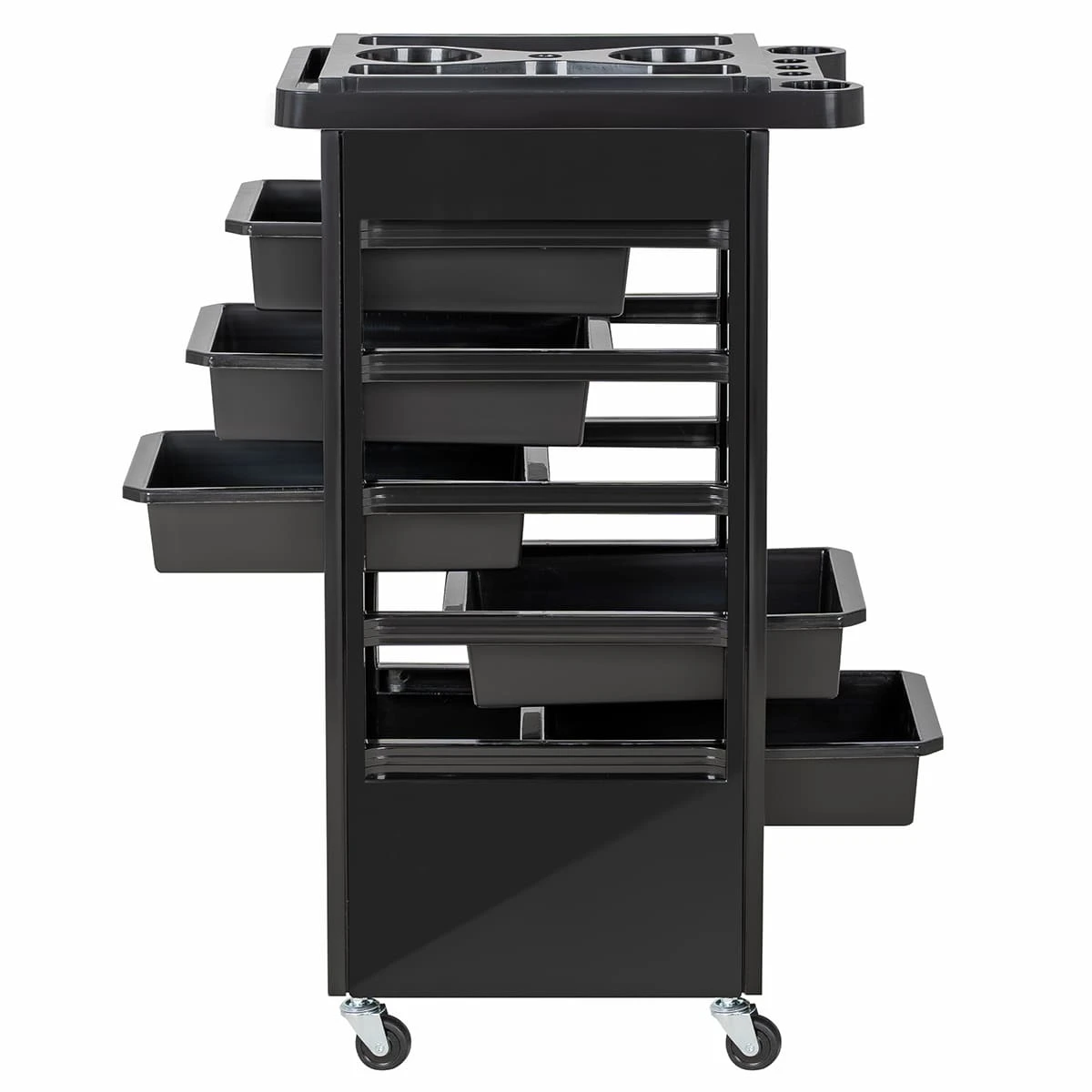Комплектуется пятью выдвижными ящиками. В верхней крышке есть отверстие для фена диаметром 60 мм. Колеса резиновые в металлическом каркасе.
