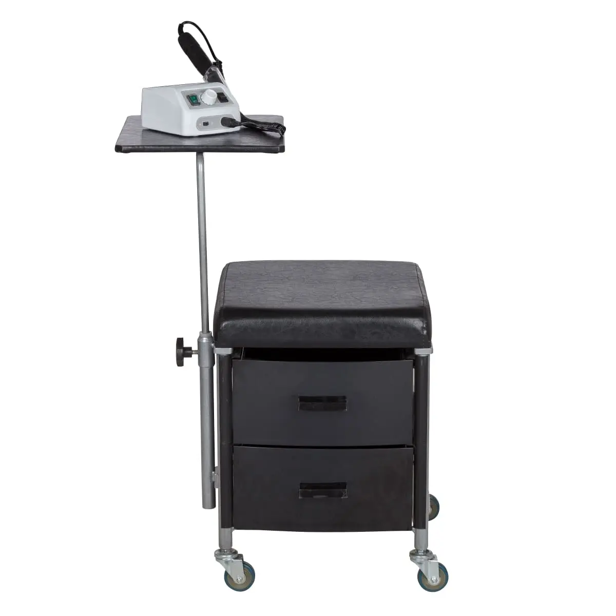 На удобном пуфике мастер может с комфортом провести процедуры. Под сидением предусмотрены два вместительных ящика под необходимые инструменты мастера. Столешницу можно регулировать по высоте, чтобы подобрать оптимальную высоту для работы. Чтобы сэкономить время специалистов, стул для мастера педикюра оснащен поворотными колесами, которые позволят легко перемещаться, не вставая с места.