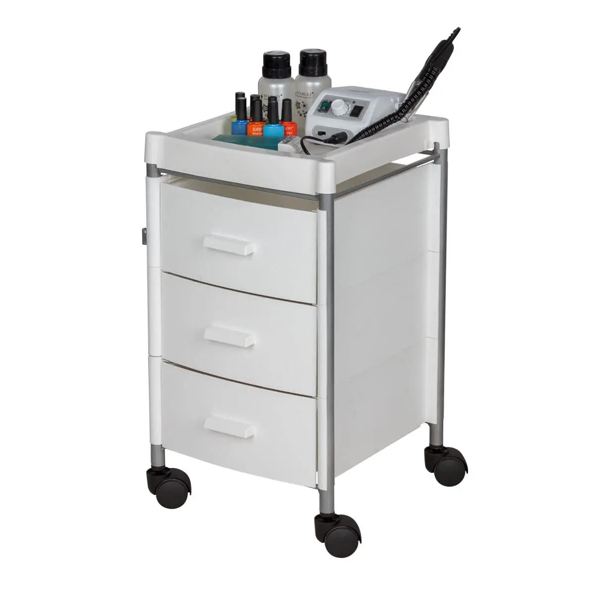 Качественные материалы и фурнитура обеспечат долгий эксплуатационный срок. Для изготовления каркаса использована прочная сталь. Крышка, стены и ящики выполнены из качественного пластика. Материал легко моется, не деформируется при дезинфекции и случайном попадании косметических препаратов. Пластиковые колеса не способны навредить напольному покрытию.
